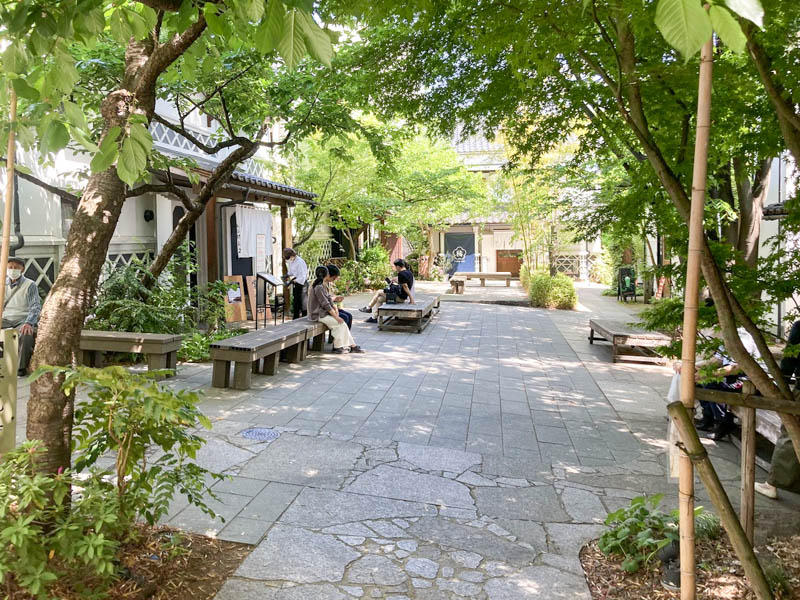 蔵を活用したおしゃれなお店たちの中心に広めの庭(広場)があり、植栽が多く植えられていて日影が多く、ベンチに座って公園さながらに気持ちよくまったりできます。