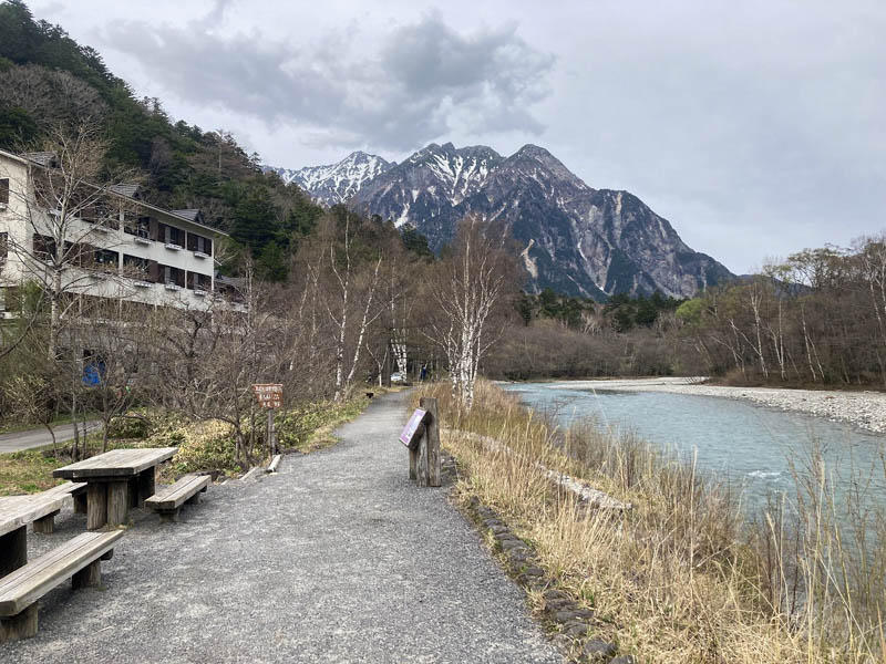 何より上高地のいいところは、あちこちにベンチとテーブルが設置してあるところ。