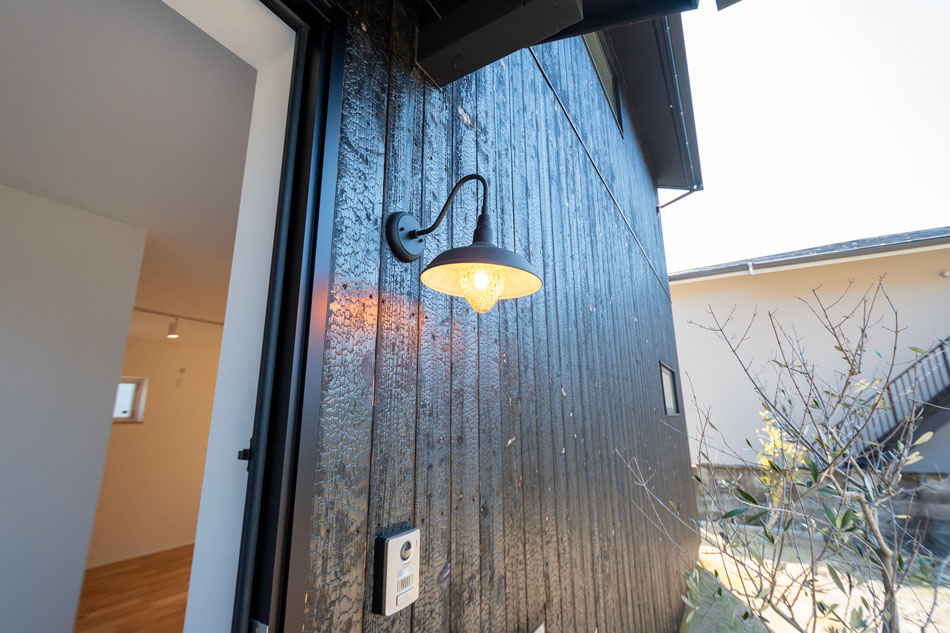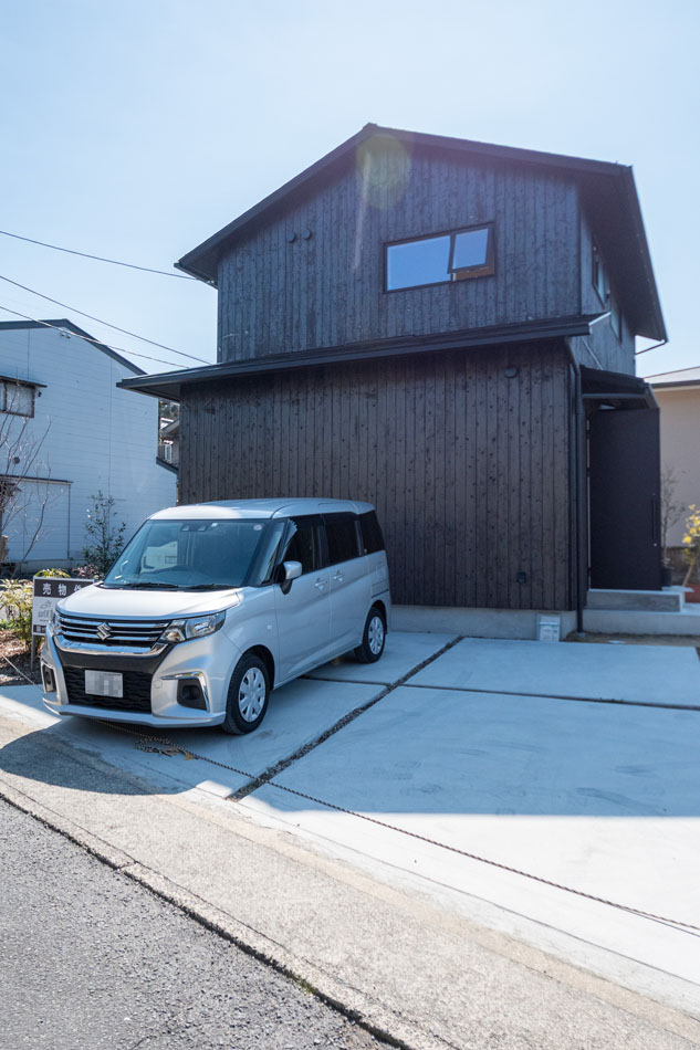 黒の外壁は焼杉板の縦張りで、駐車場には車が二台駐車可能です。