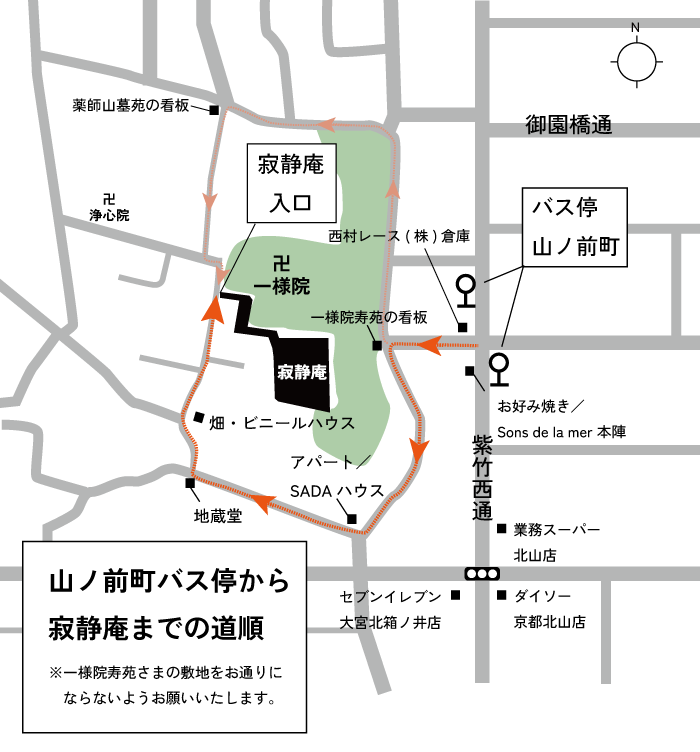 寂静庵の入口は、敷地の西側となっております。内覧の際は、こちらの道順(オレンジの矢印)を参考にお越しくださいますよう、お願いいたします。