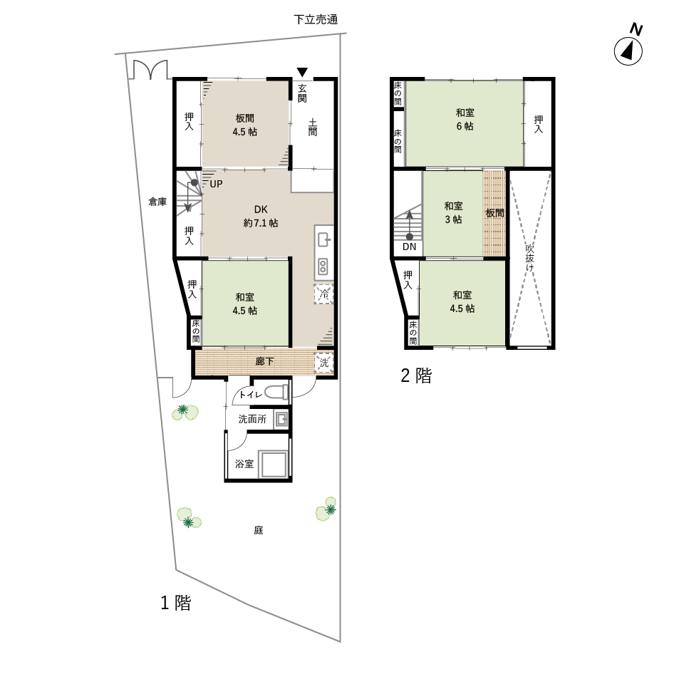 建物面積 | 【公簿】1階:42.97m² 2階:34.38m² 延べ:77.35m²(約23.39坪) |