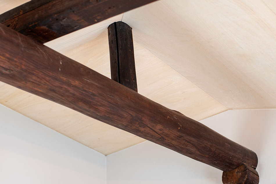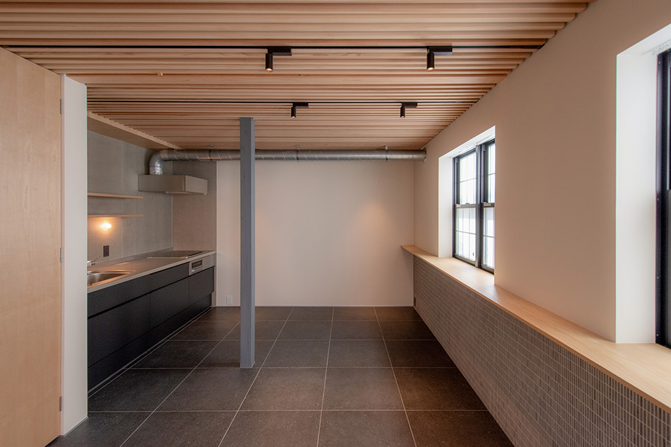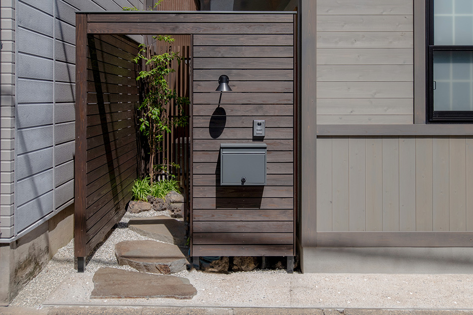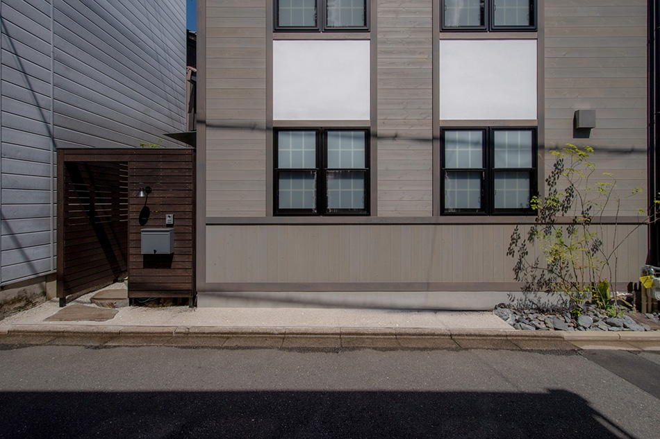 建物は明治築の町家です。もとの建物も普通の町家ではなく、どこか洋館を思わせる外観をしており、今回のリノベーションで板張りと四つ窓のデザインを施しました。家のすぐそばにある大正時代のモダニズム建築「京都市考古資料館(旧西陣織物館)」にも通じる、大正ロマンを感じさせる外観には、この街を支えた西陣織の歴史が薫ります。