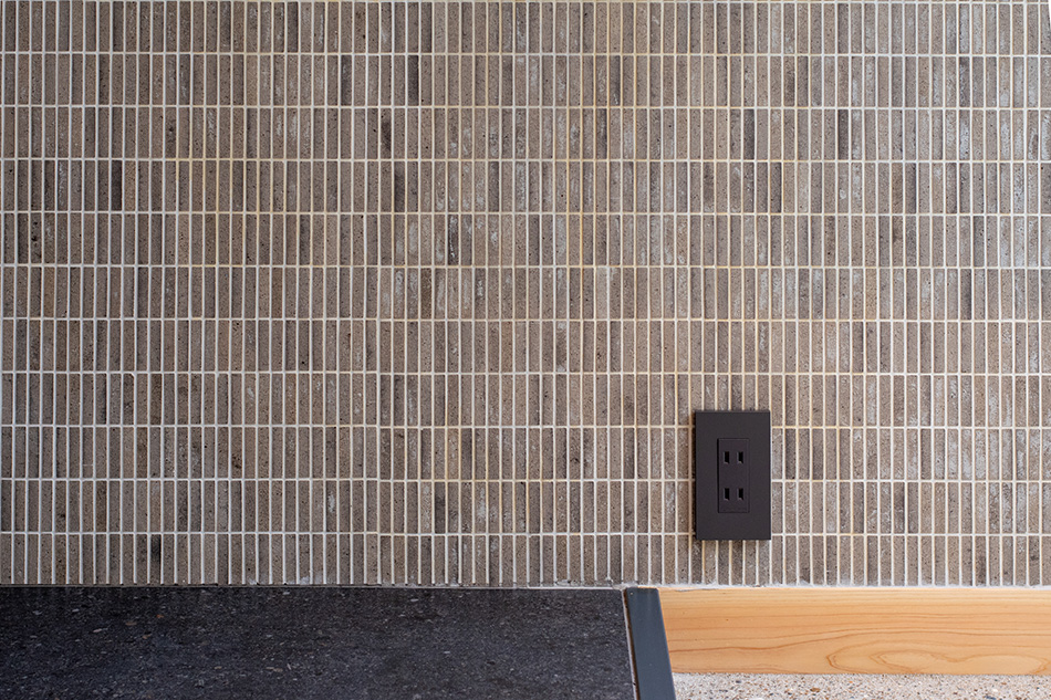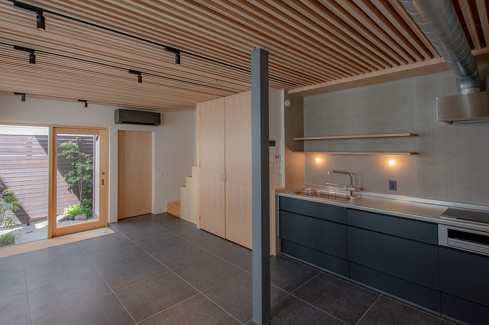 窓からやわらかく光が射す1階。仕切りのないLDKは、真ん中に大きなダイニングテーブルを置き、家族や友人が訪れて食卓を囲むようなイメージをコンセプトに作られています。庭への視線の抜け、窓際に付いた長い木のカウンター、床のタイルと天井や扉の木材の素材感、さりげないデザインの階段などが、上質な料亭を思わせます。