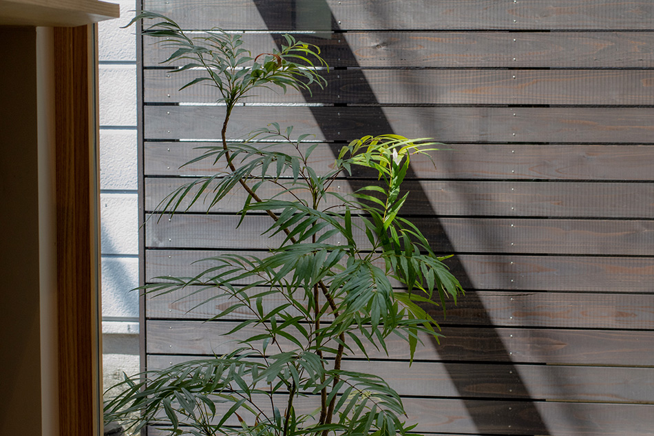 間口の広い敷地のため、南向きに作った窓から陽の射す明るい住まい。西側に付いた小さな庭を通り、室内へと入ります。1階は、大きなLDKのあるひとつながりの空間。シンプルな四角い空間には、光が差し込む印象的な窓があり、庭へと開いた玄関の窓が景色を作ります。