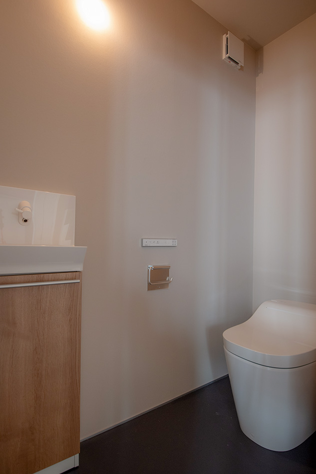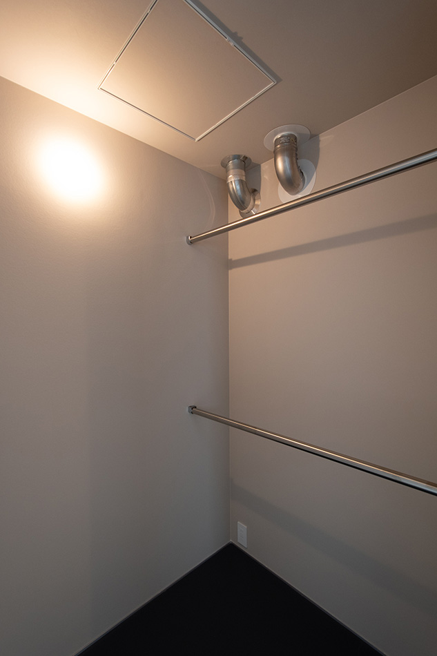 階段を上がった2階洋室の隣にあるのは、洗面・浴室の水廻りと、家の中の収納を集約させて使えるWIC。ホテルのような使い勝手の良さのある間取は、ここでの暮らしを心地よく整えてくれます。