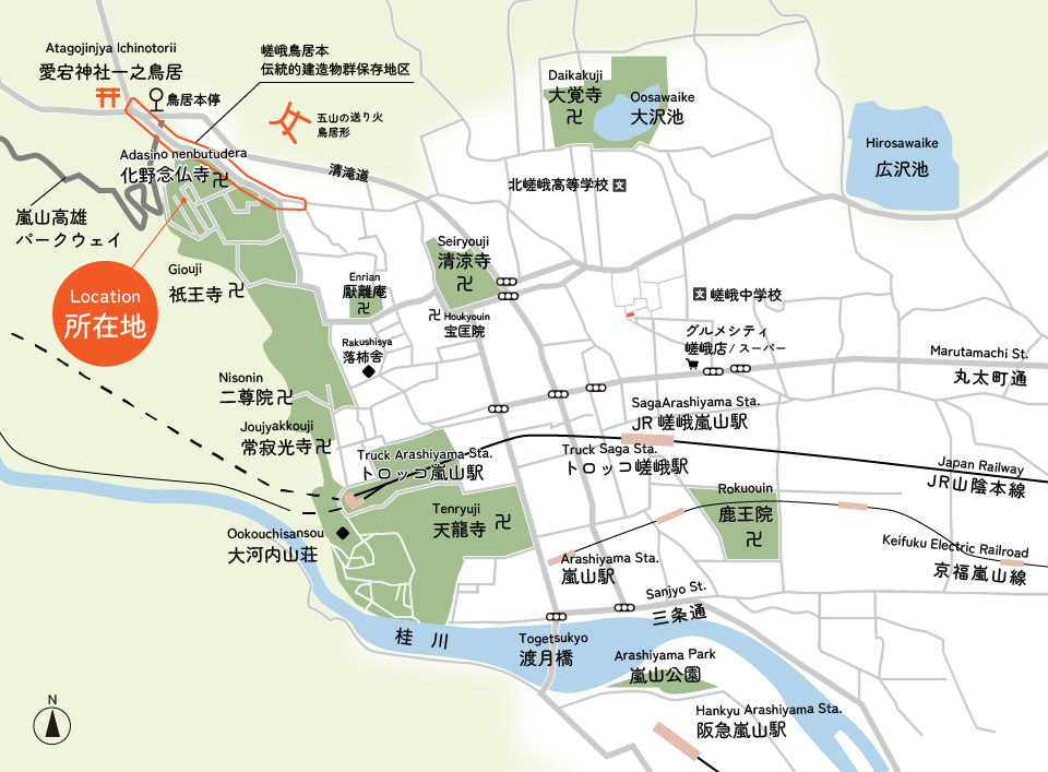 JR山陰本線「嵯峨嵐山駅」北口 徒歩約28分 | |