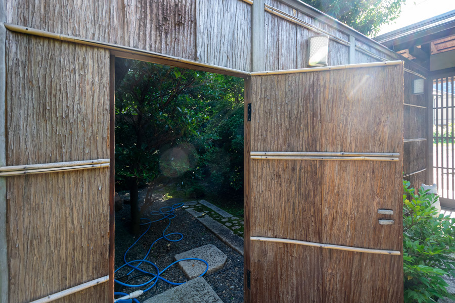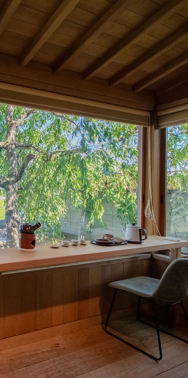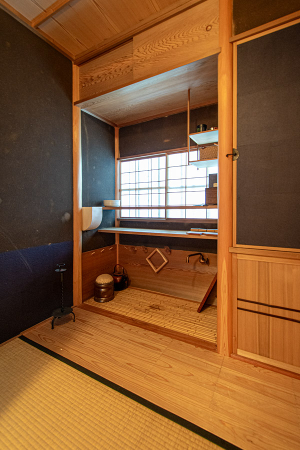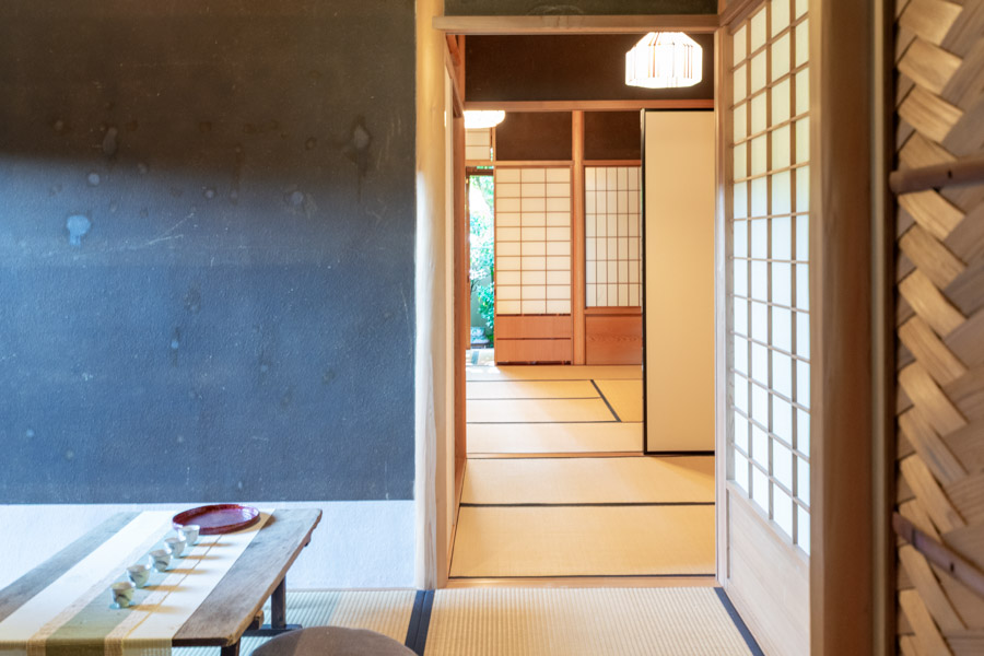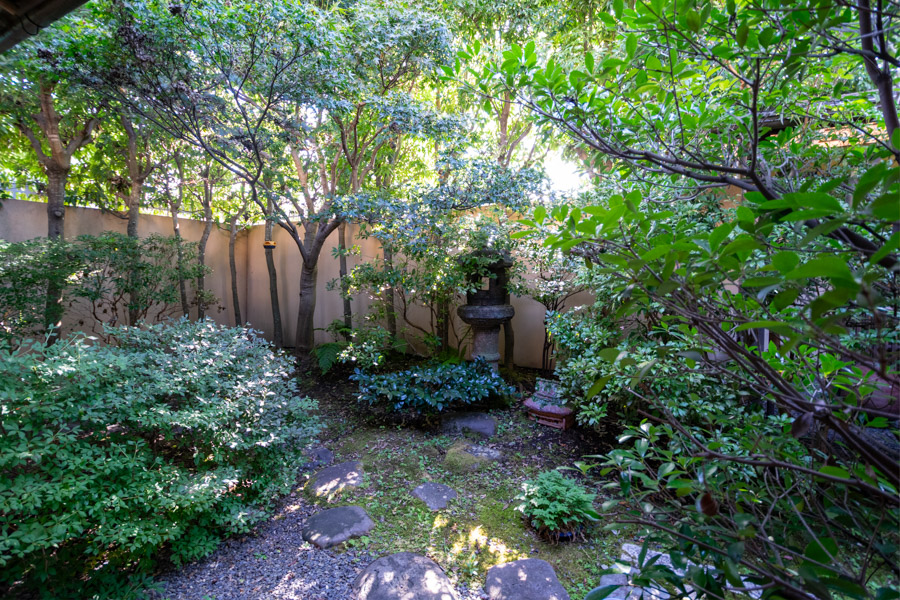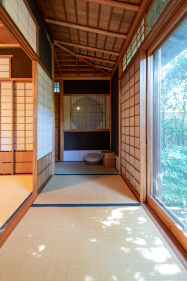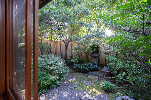 玄関まで続く石畳のアプローチを抜けると、まず畳の間が広がり、南側の小さな庭を望めます。奥には水屋と押入、そして庭に面した和室が続き、庭にある躙口(にじりぐち)のあしらいとともに茶の湯の趣きを感じられる設えです。