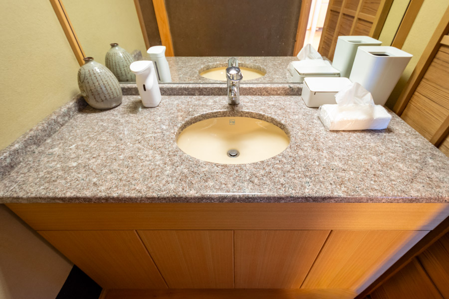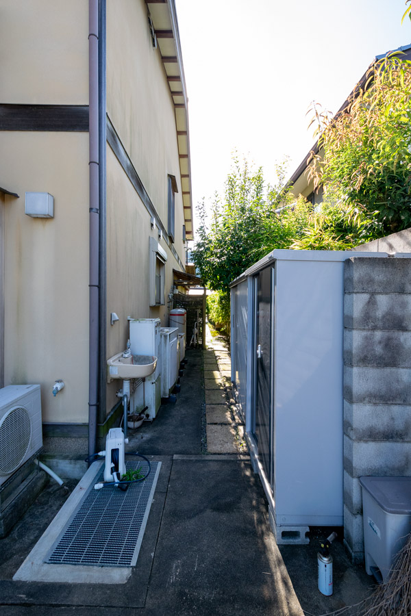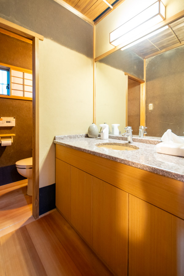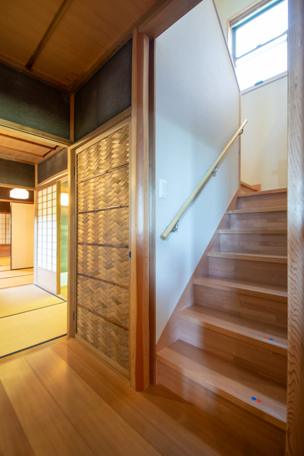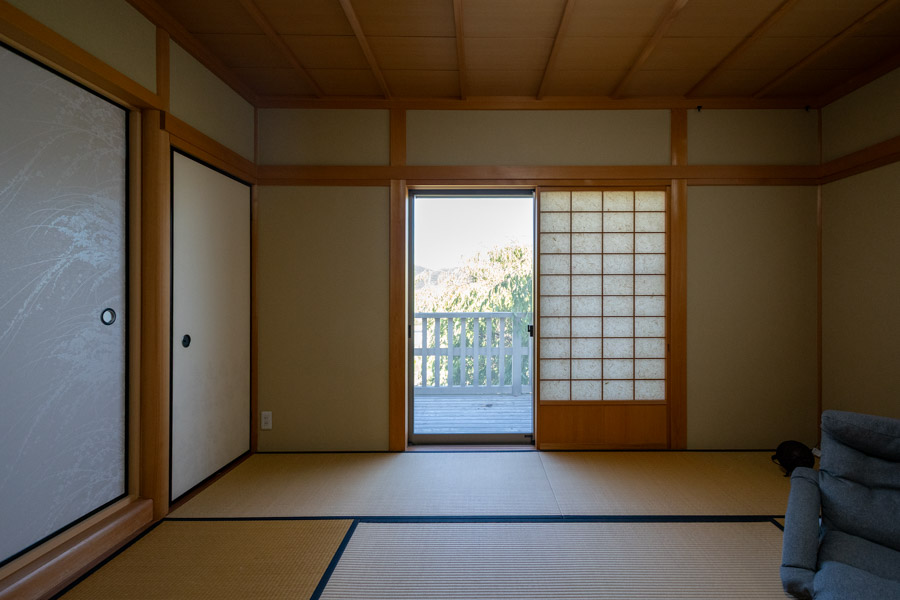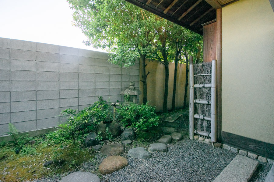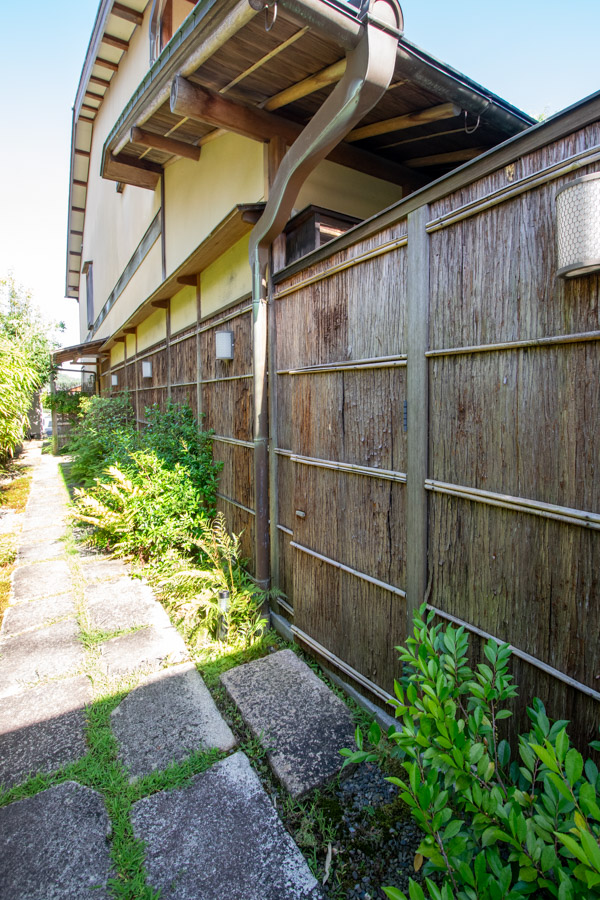 玄関まで続く石畳のアプローチを抜けると、まず畳の間が広がり、南側の小さな庭を望めます。奥には水屋と押入、そして庭に面した和室が続き、庭にある躙口(にじりぐち)のあしらいとともに茶の湯の趣きを感じられる設えです。