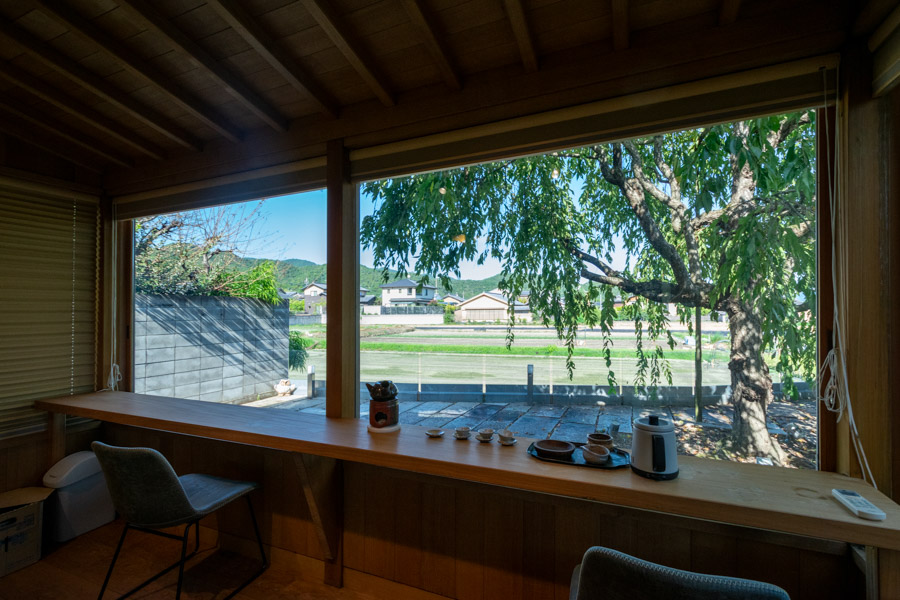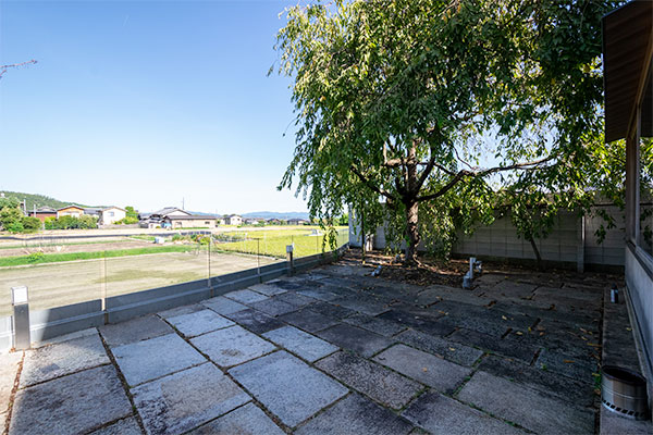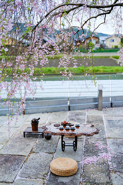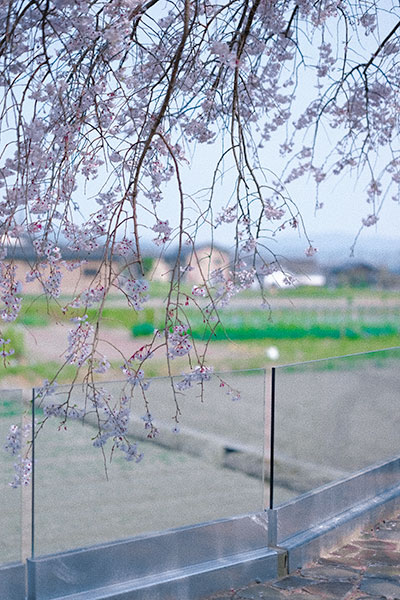 春、枝垂れ桜の花びらが舞う庭の向こうに広がるのは、嵯峨の田園風景。古都の情緒と自然美が溶け合う、この地ならではの景色を愉しめる物件です。