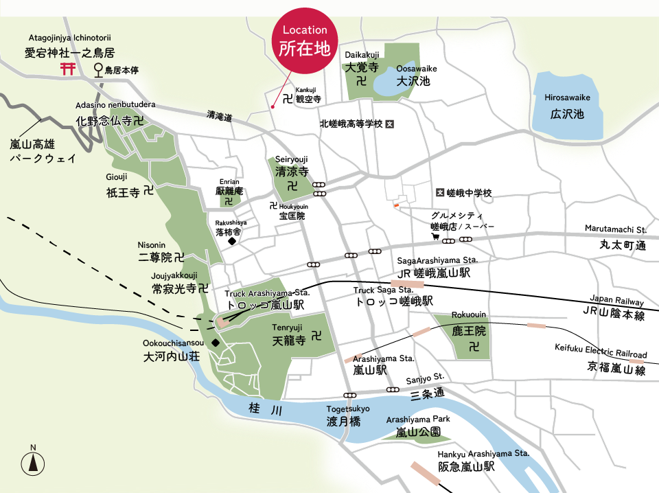 交 通 | JR山陰本線 「嵯峨嵐山駅」北口 徒歩約18分 |