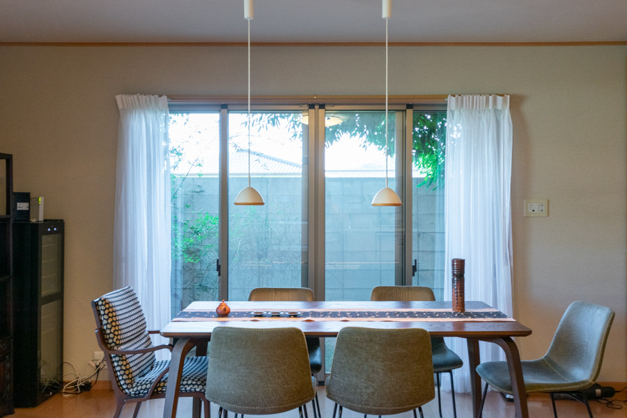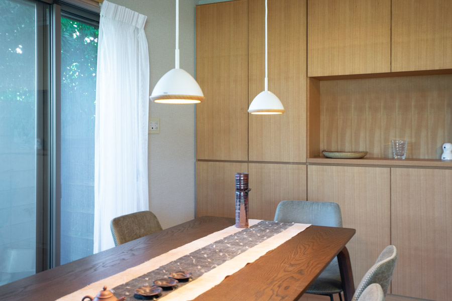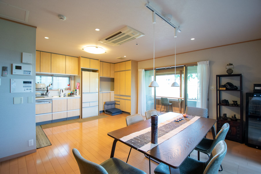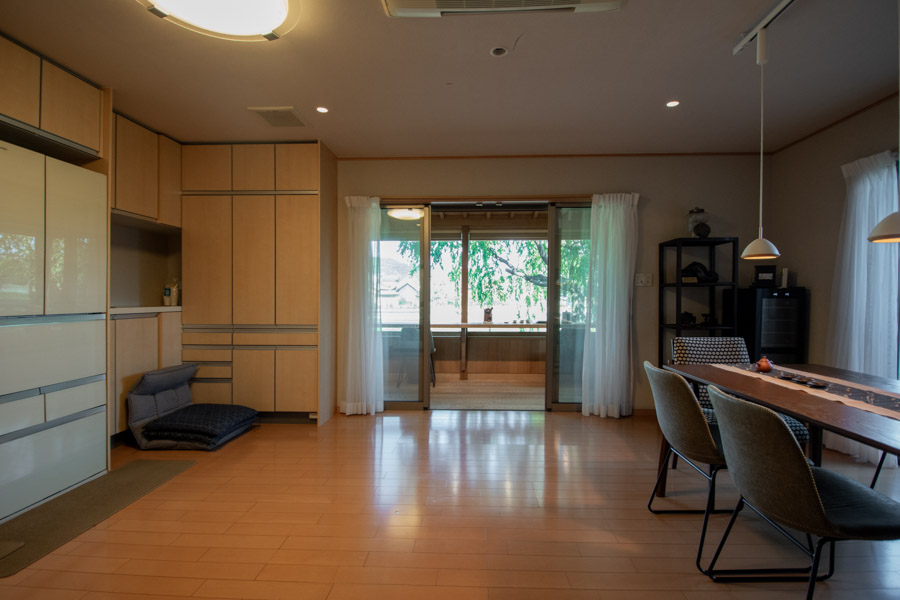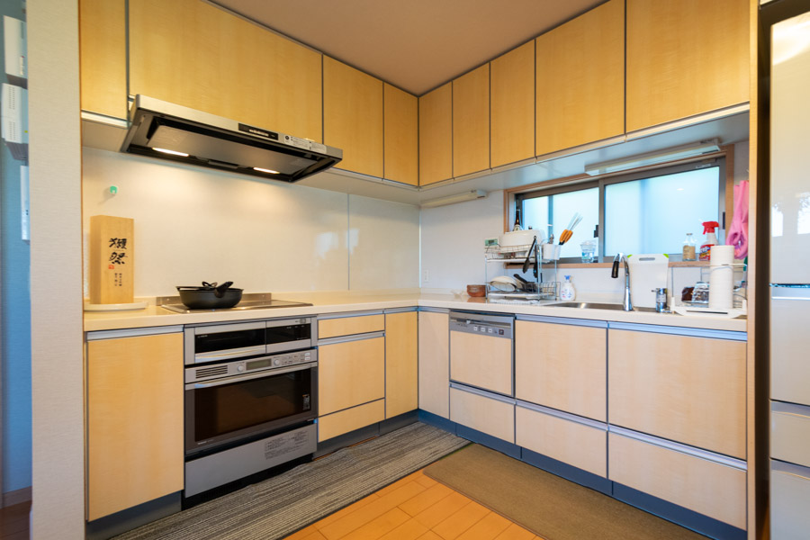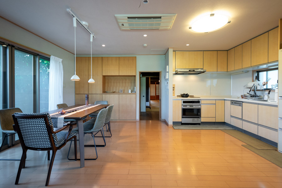 LDKはゆとりある広さで、キッチン周りには造り付けの棚を備え、収納力も充実。大きな窓の先にはテラスと枝垂れ桜の庭が広がり、陽光がたっぷりと差し込む明るいリビングで、室内にいながら開放感を味わえます。快適な暮らしを支える床暖房やオール電化、防犯や利便性に配慮した自動シャッターなど、設備面も充実しています。