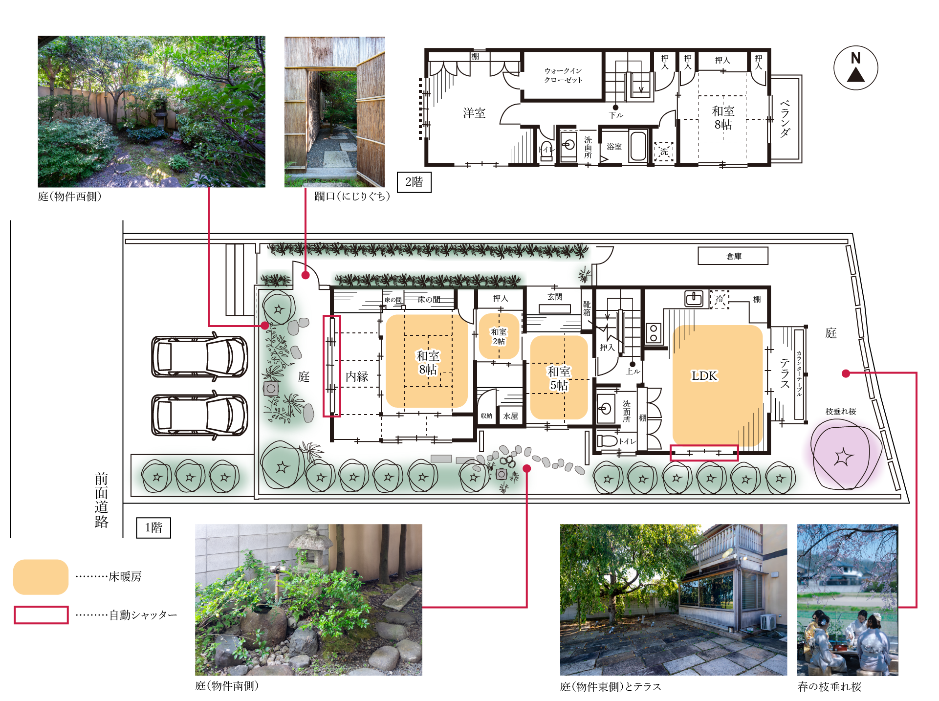 5LDKのゆとりある間取りと、堂々としたアプローチがつなぐ東西の庭。東側では枝垂れ桜や季節の花々を、和室に面した西側の庭では静かな時間を愉しめる――邸宅ならではの贅沢な住まいです。