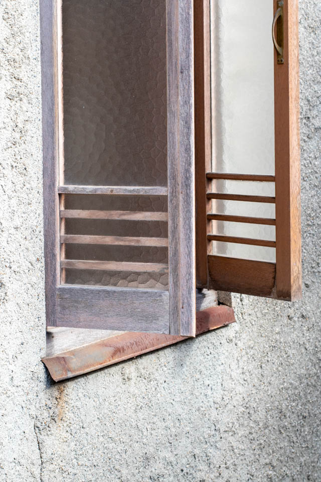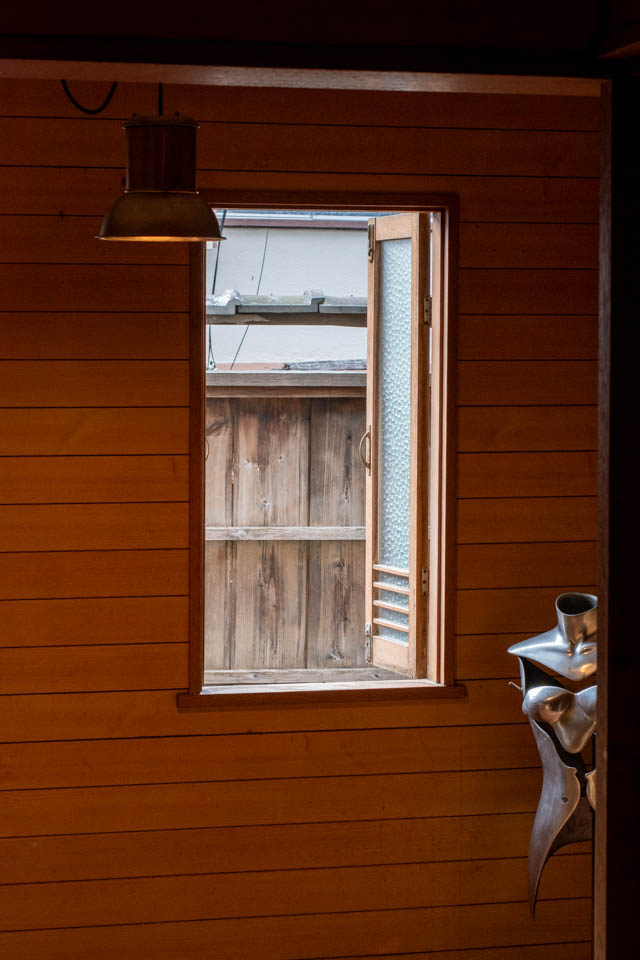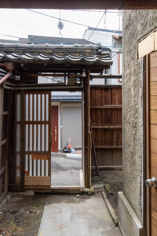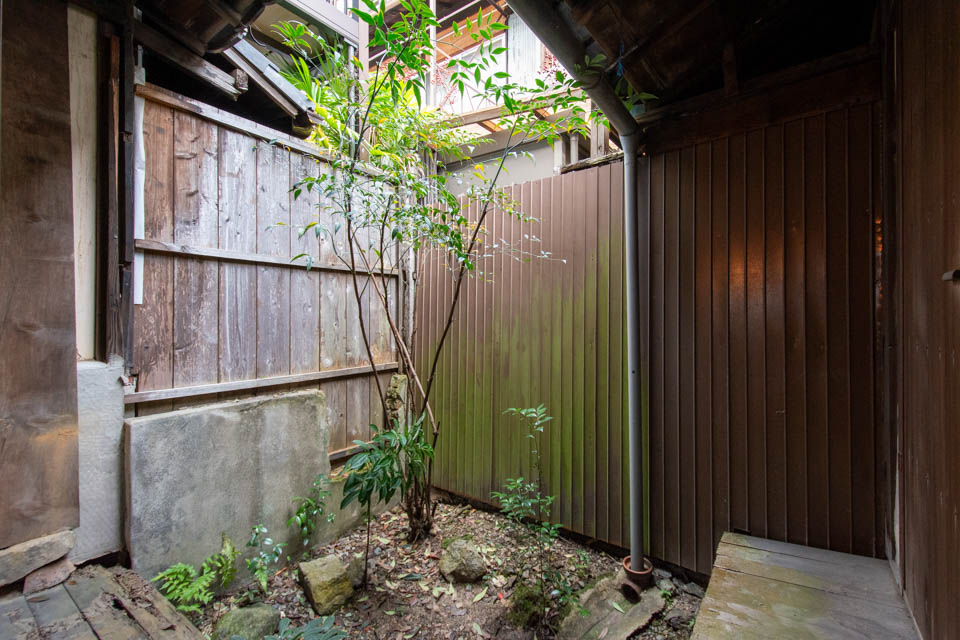 ドイツ壁の京町家(西)は木の塀で囲まれた入口へ一歩入るとミセノマの愛らしい木枠窓が迎えてくれる洋風な雰囲気を醸す。庭やトオリニワなど町家らしい間取りが残り、改装の妄想を膨らませるのが楽しい1軒です。