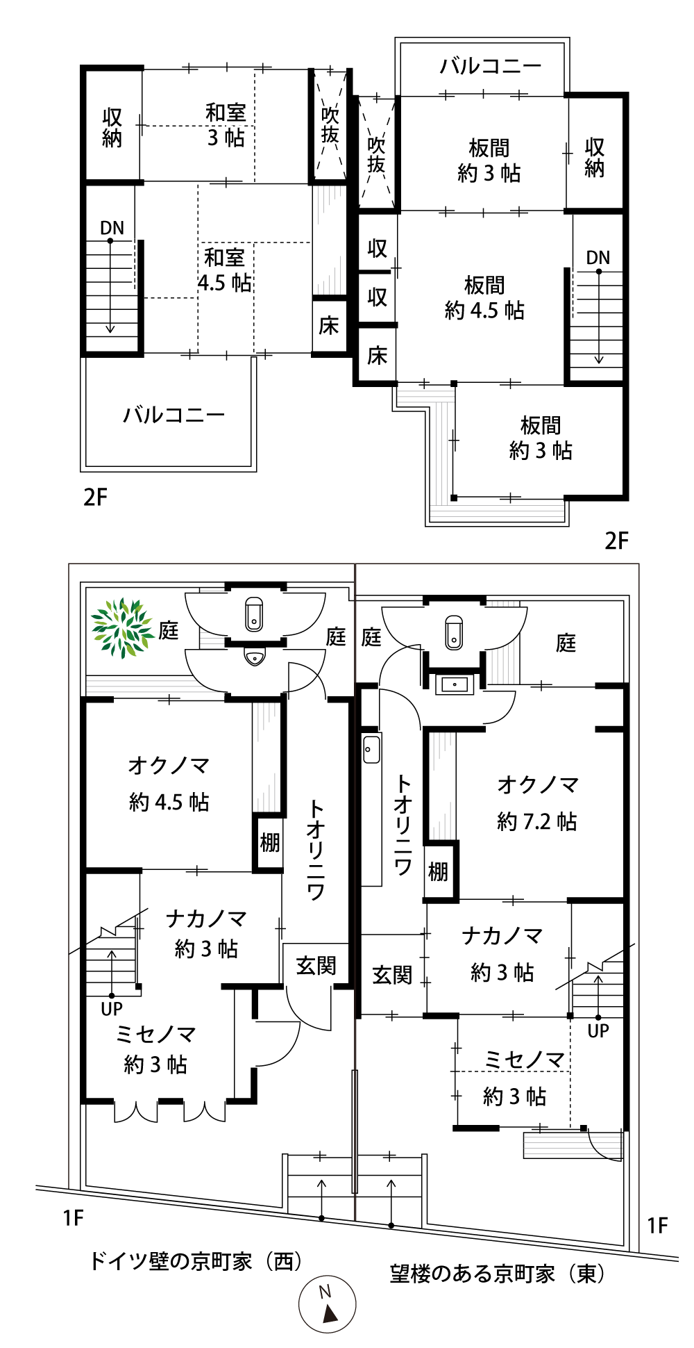 大塀造を思わせるような立派な塀のあるお家です。2軒とも1歩足を踏み入れると、トオリニワ、ミセノマ、オクノマ、庭、トオリニワと京町家らしい間取りとなっています。