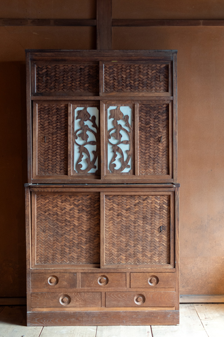 こちらの町家には伝統的な水屋箪笥が残り、前面には竹や木を編み込んだ網代(あじろ)仕上げや透かし彫りが施された意匠が魅力的です。実用性と美しさを備えた造りとなっています。