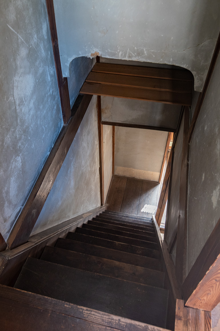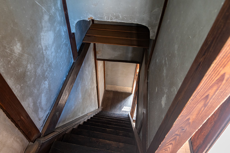 階段の上部には、やわらかな曲線を描くアール壁が設けられています。このような曲線の意匠は空間に柔らかさと奥行を与える特徴的なデザインで、圧迫感を軽減する役割もあり、京町家ならではの美意識を感じられるポイントです。