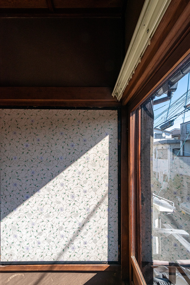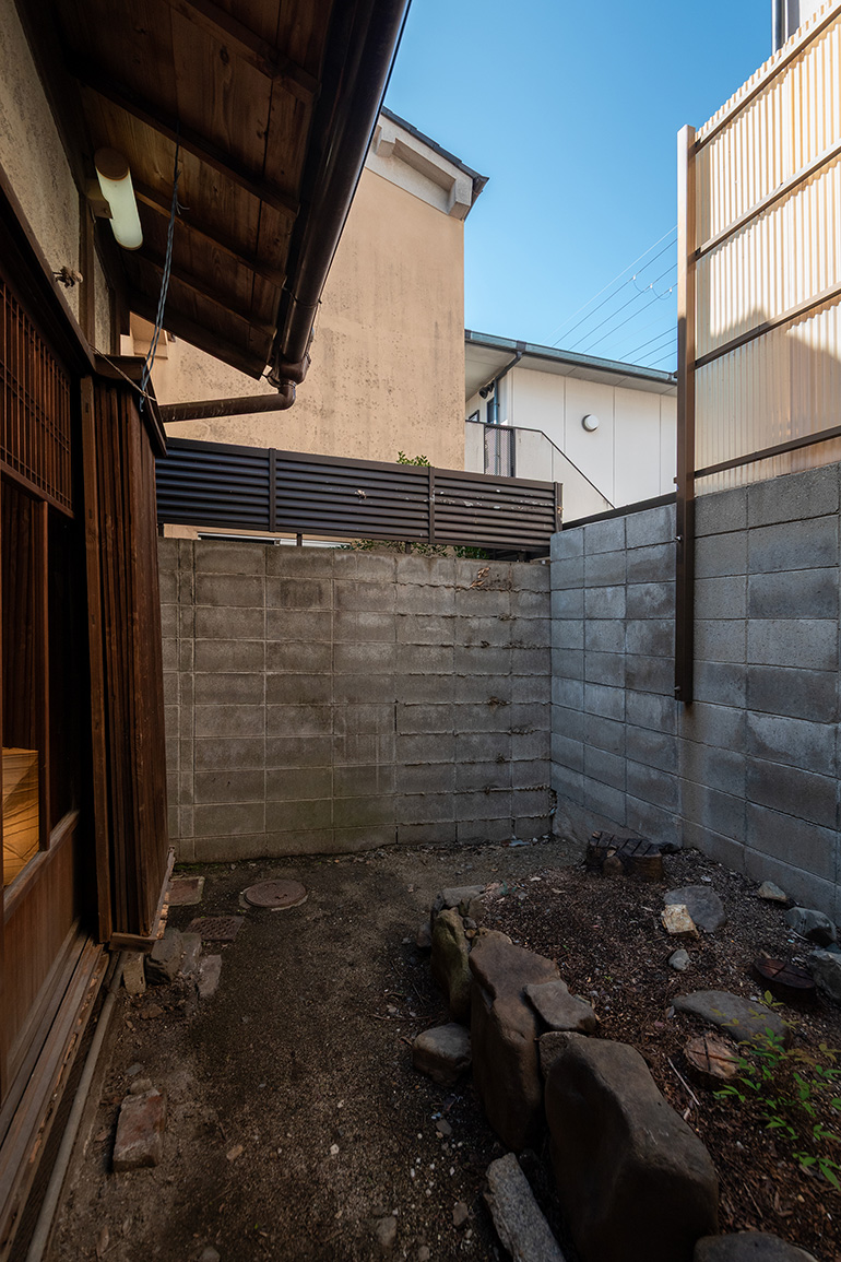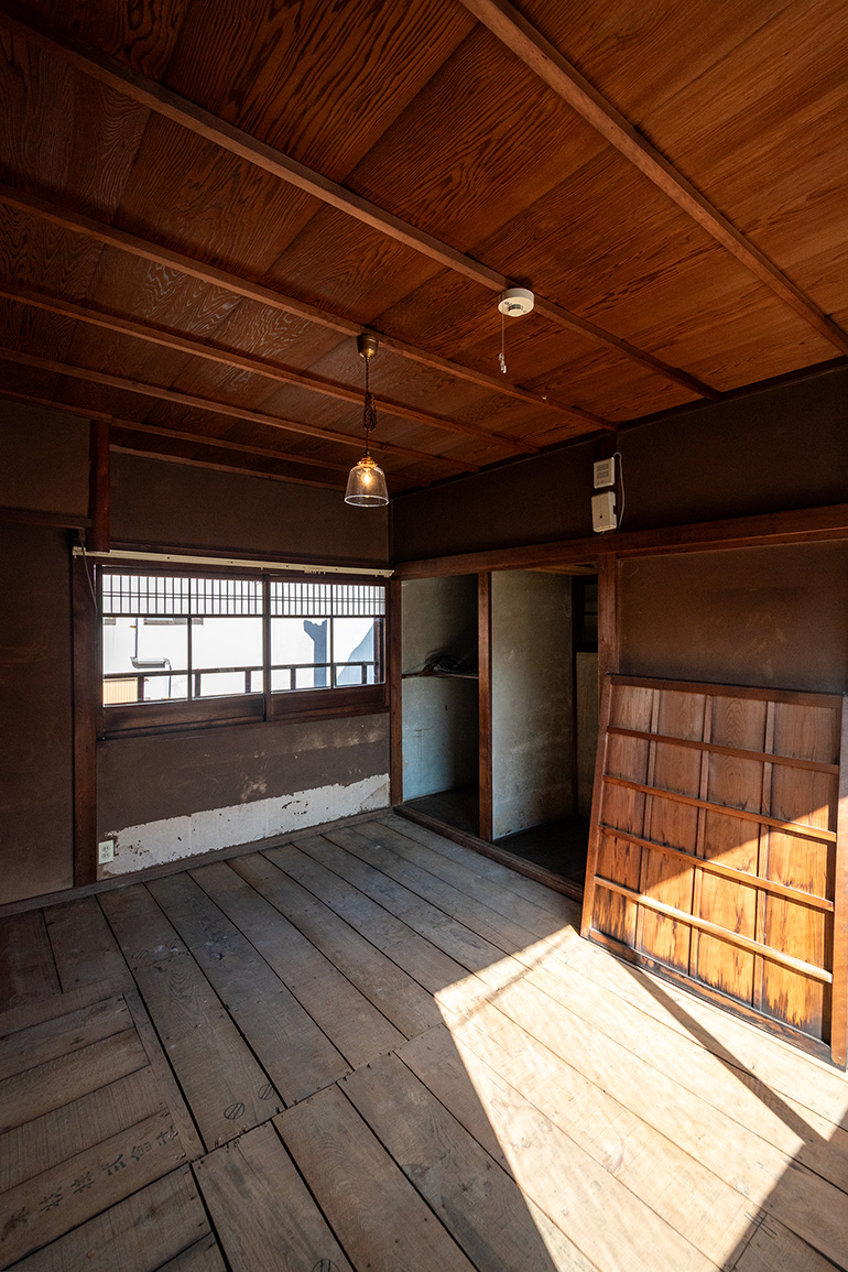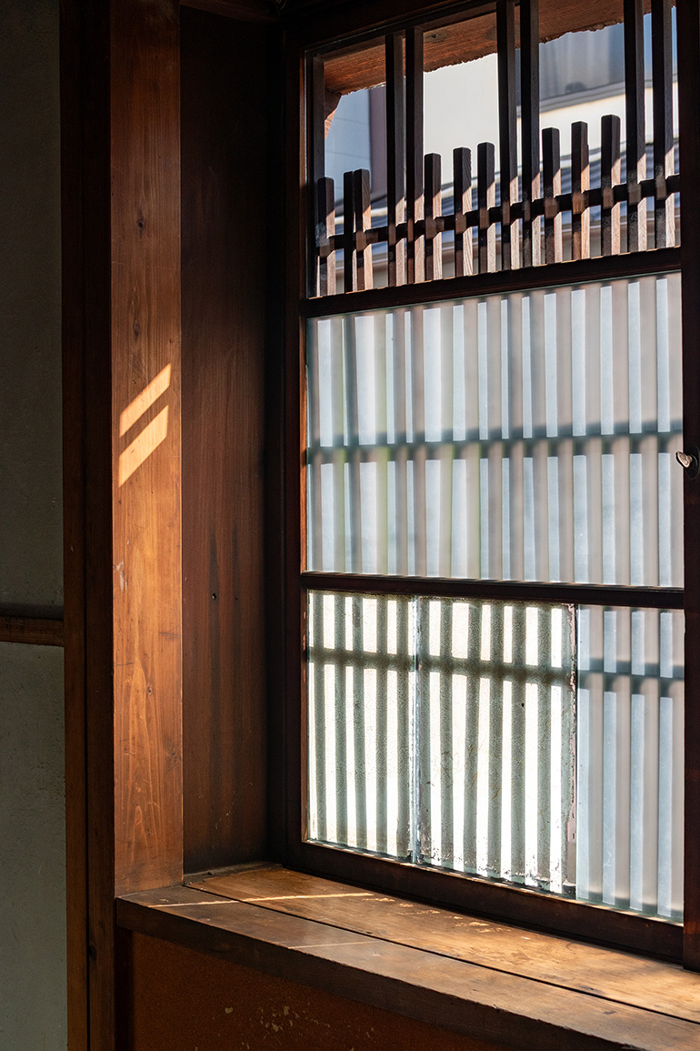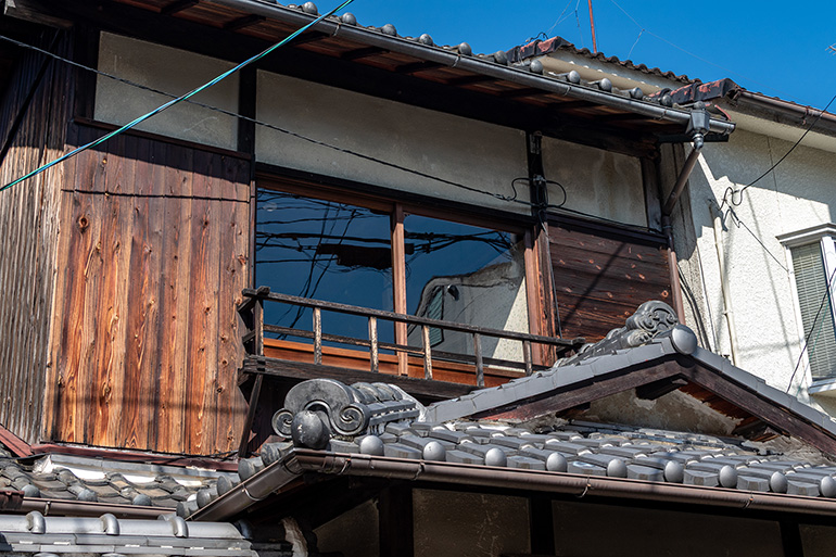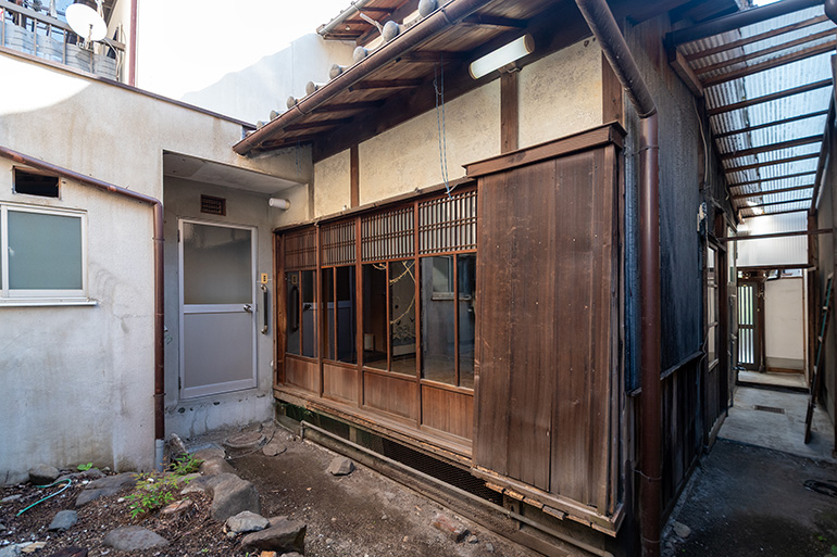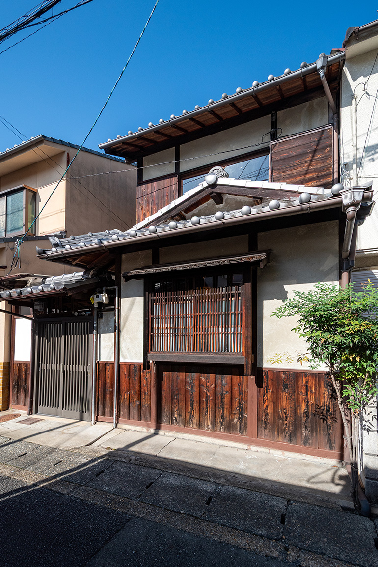 一階正面には縦格子窓を備え、やわらかな光を室内に取り込みながら外からの視線をほどよく遮る、町家ならではの意匠が残されています。外壁は板張りと土壁仕上げで、長い年月を兼ねた風合いが趣を添えています。