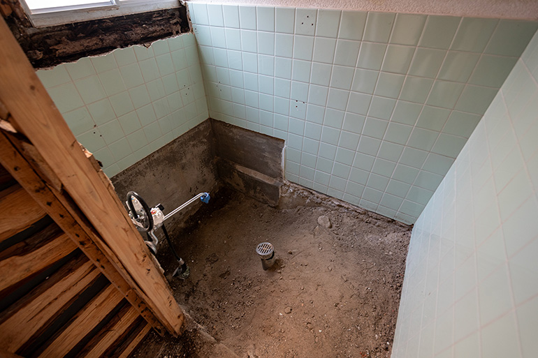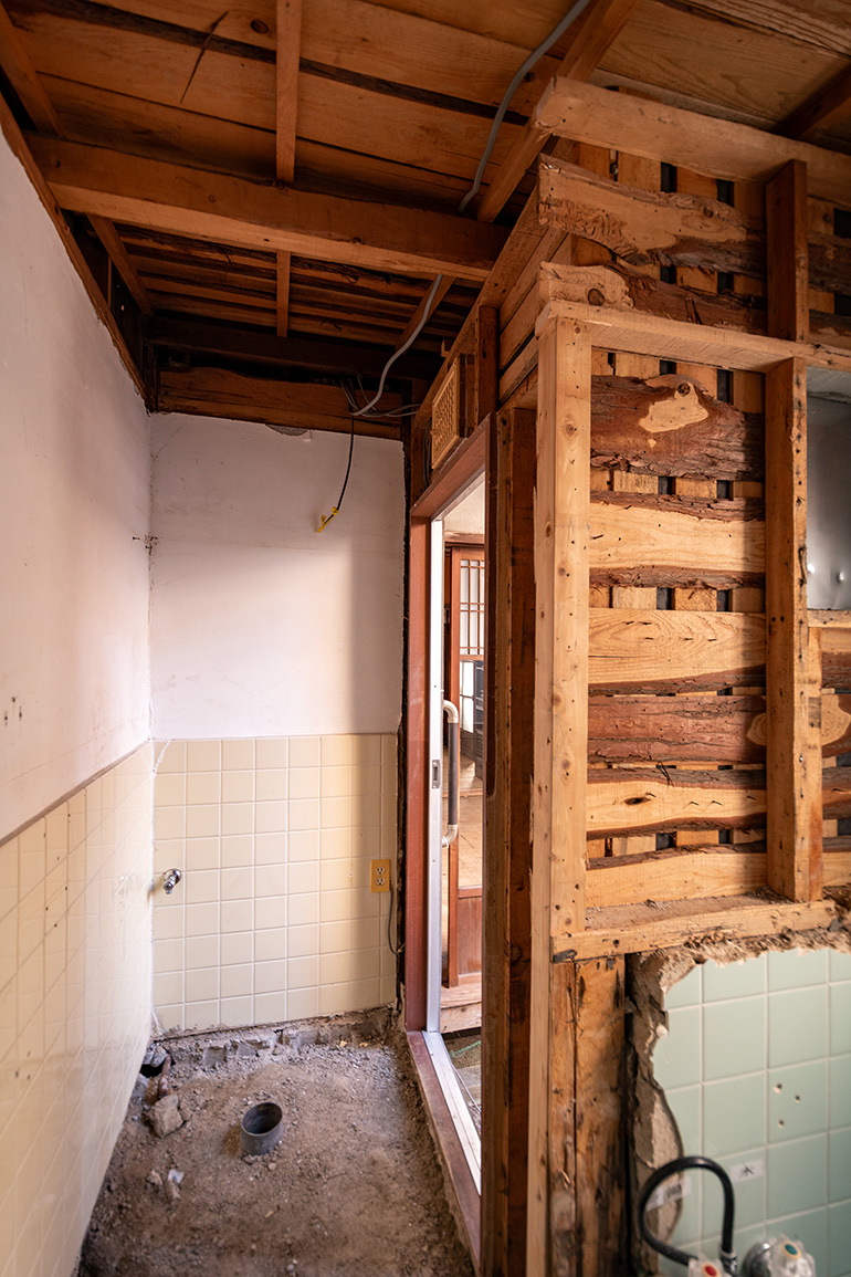 内部は一部解体され、内装材が取り払われているため、構造躯体の柱や梁をご覧いただける状態です。