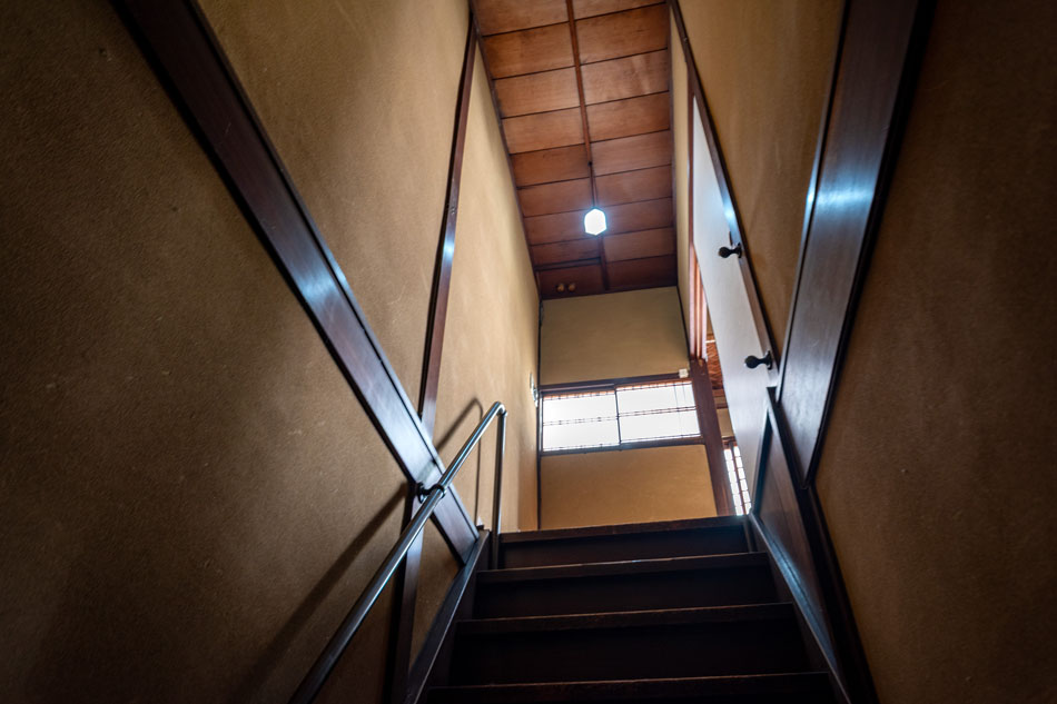 階段を上がると、月を思わせる円窓や、四季を楽しめる床の間と吊床など、二階にも趣あるしつらいが広がります。