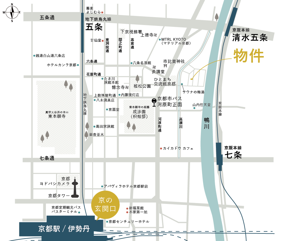 京阪電車「清水五条駅」1番出口から徒歩約5分、京都駅や阪急「河原町駅」も徒歩圏内という立地。