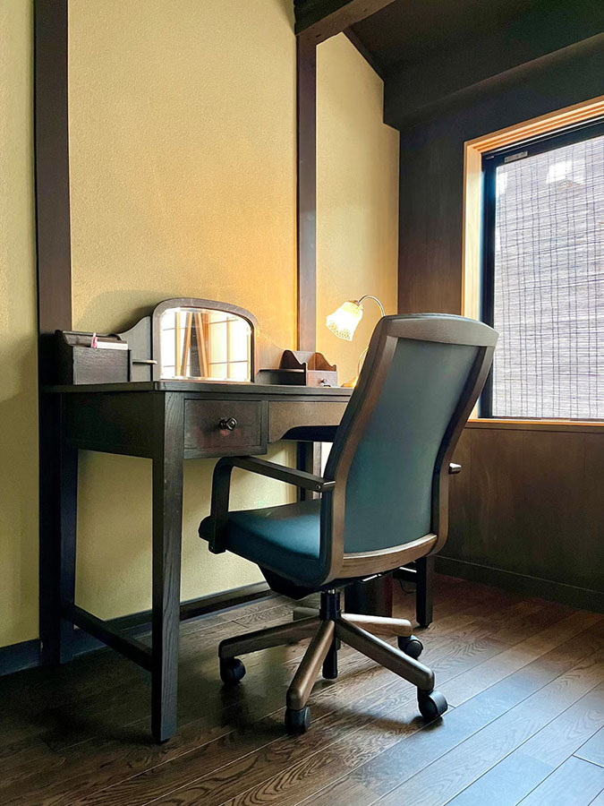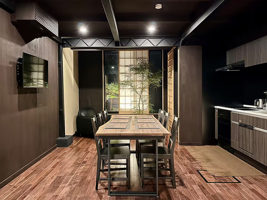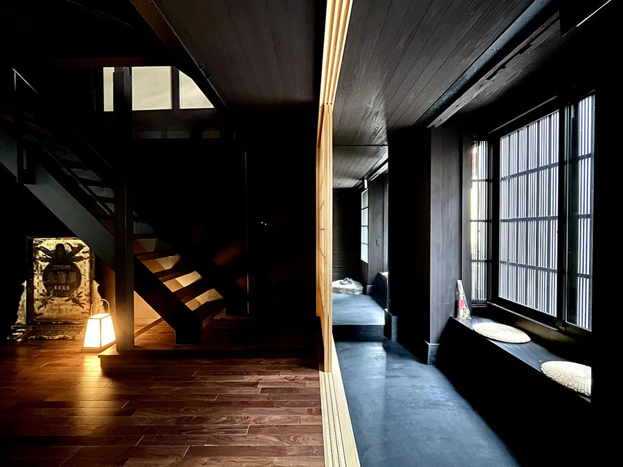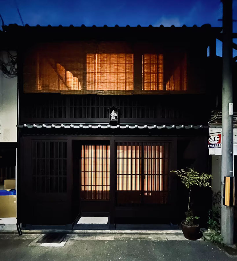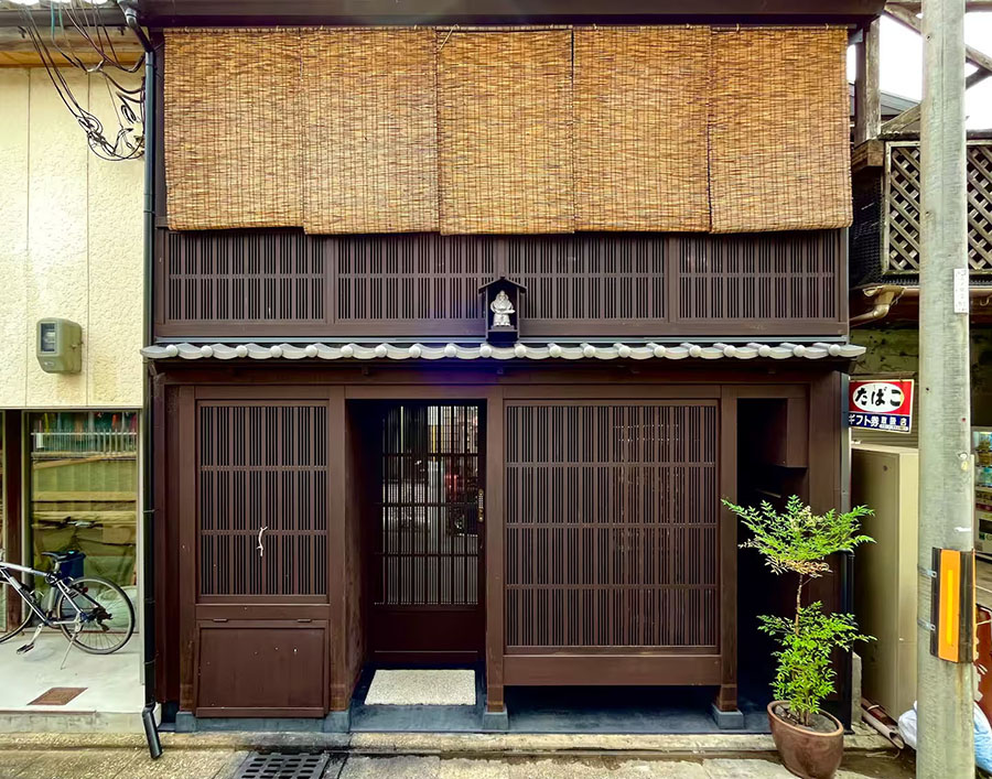 縦に奥行きのある造りと、趣ある格子窓が印象的な外観は、昔ながらの京町家らしさを色濃く残しています。