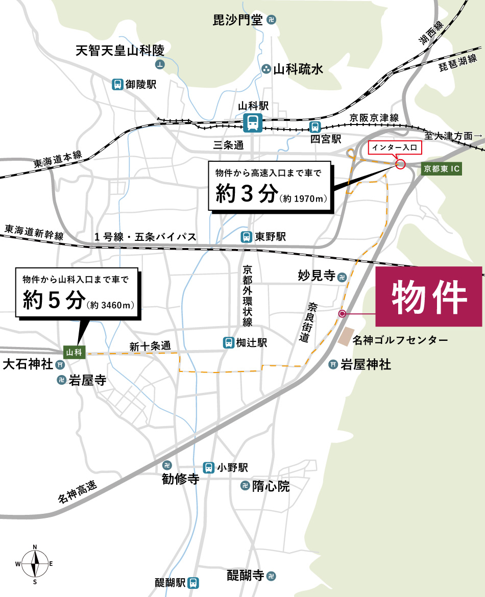 名神高速道路の京都東インターから約2.9km、第二京阪道路の鴨川東インター山科出口から約3.6㎞と高速道路の利用が便利なところにあり、関東圏や大阪・神戸へのアクセスが容易です。
