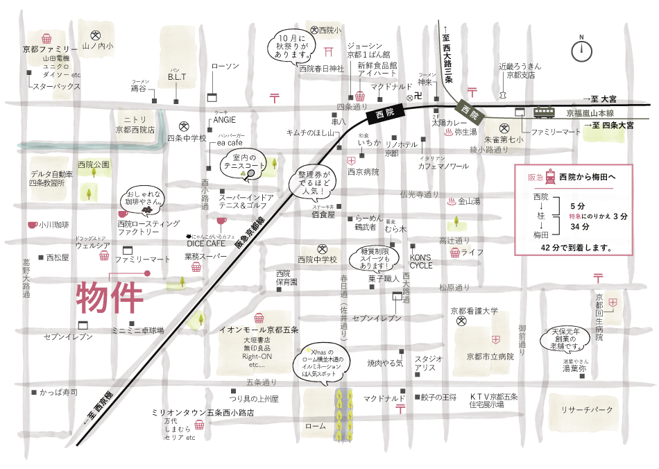 最寄り駅の阪急「西院駅」から「京都河原町駅」までたったの3駅(乗車時間約6分)。京福電鉄(嵐電)「西院駅」を使えば嵐山方面へ行くことができます。京都の街中へも観光地へもアクセス良好です。