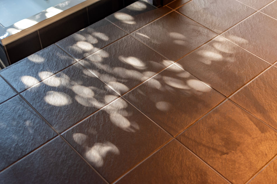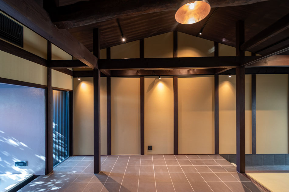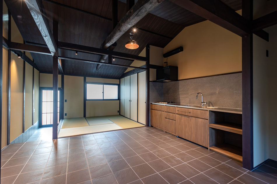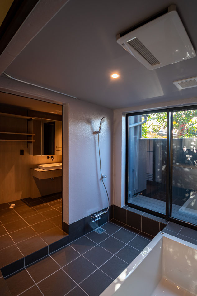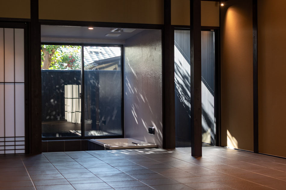 リビングはタイル床に床暖房を備え、冬も足元から快適。勾配天井と梁が、町家ならではの趣を演出します。浴室は庭を望む開放的な設計で、光と風を感じる贅沢なひととき。自然光と間接照明が柔らかな光を室内に広げます。