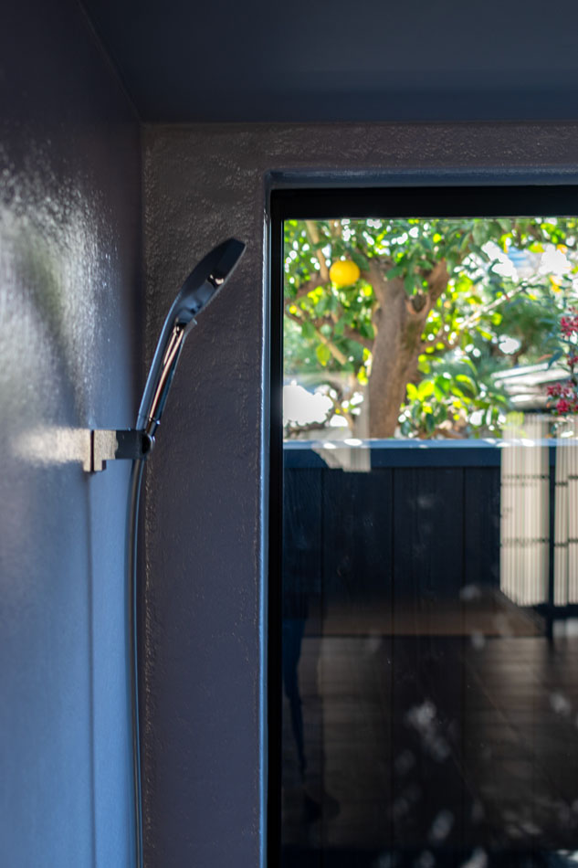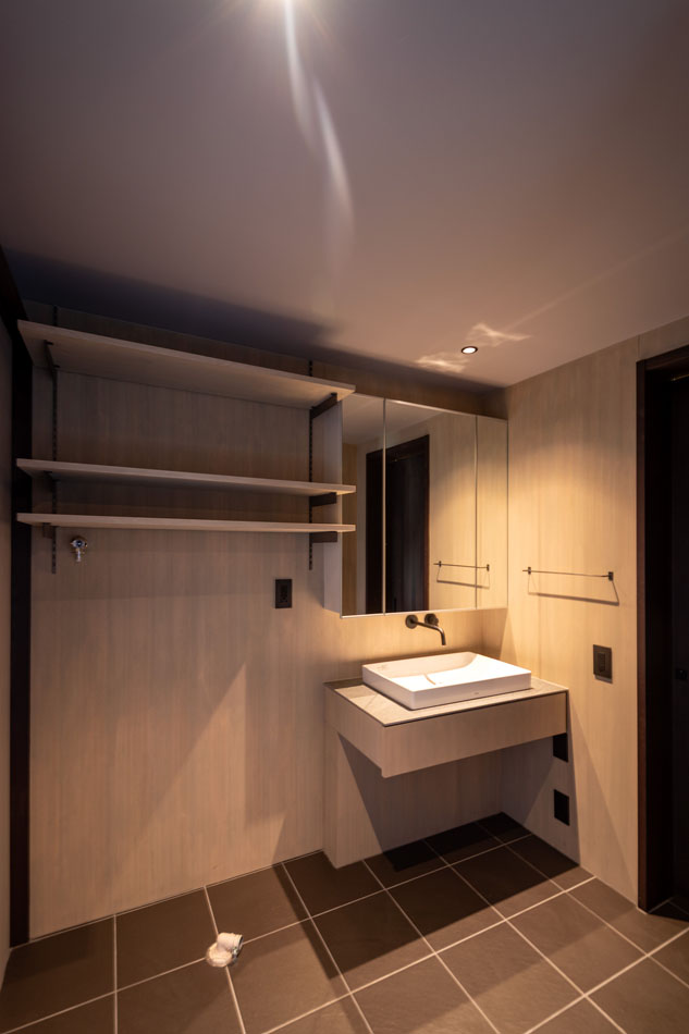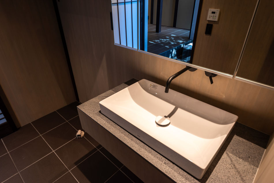 水回りは奥にまとめることで、家事や生活動線がスムーズ。洗面脱衣室から続く浴室は、ゆったりとした設計で、毎日の疲れを癒す贅沢な時間を演出します。さらに、浴室からテラスへとつながる開放的な設計により、庭に面した窓を開ければ「半露天風呂」のような心地よさを愉しめます。