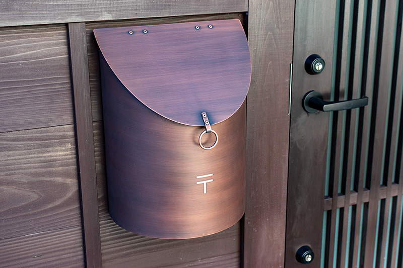 Atelier Key-men株式会社制作の郵便ポスト。シンプルなデザインに映える〒マーク。一つ一つ手作りされた商品で、手仕事ならではの味わいが魅力です。