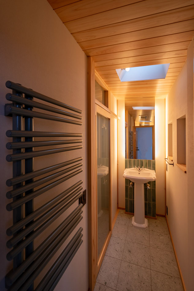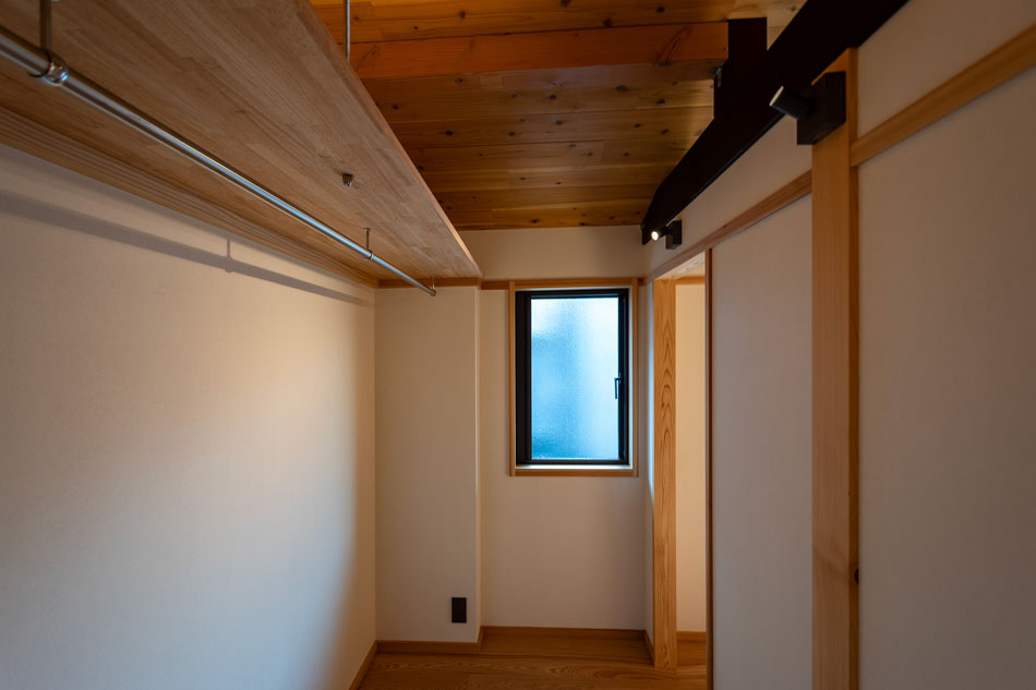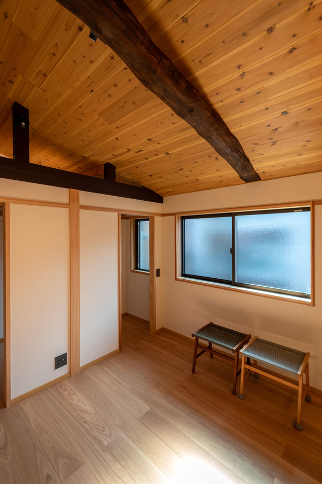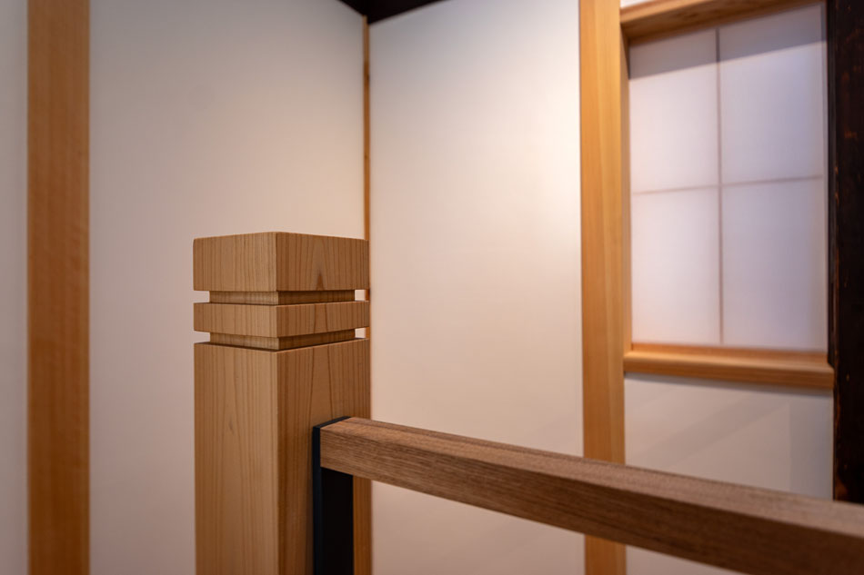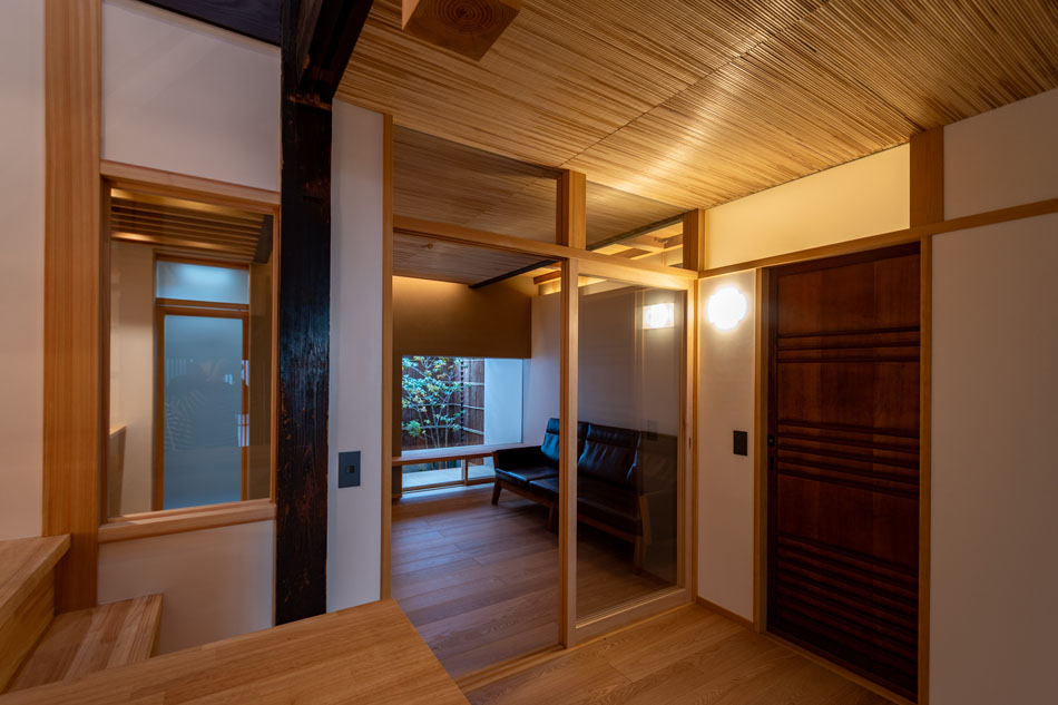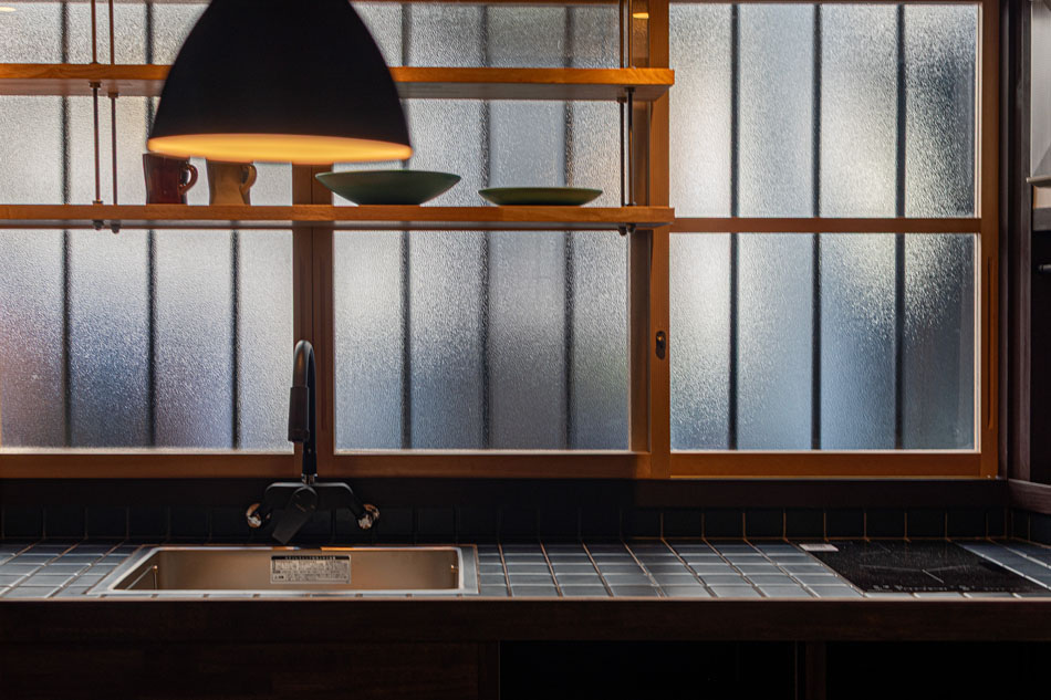 プライバシーや防犯性を重視しながらも、型板ガラスやスチールパイプ格子を用いることで、近隣の町家の意匠に調和した外観としています。室内の照明がやわらかく路地を照らし、気配を感じる程度の生活感や存在感が外へと伝わることは、地域に対して開かれた印象を生み、円滑なコミュニティ形成にもつながると考えています。