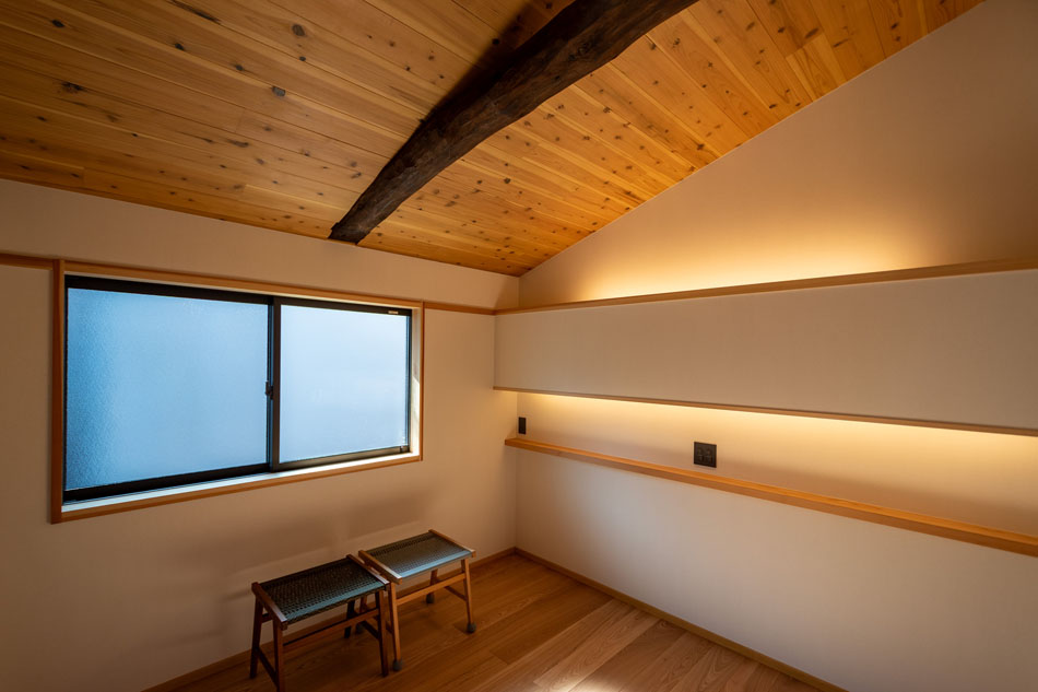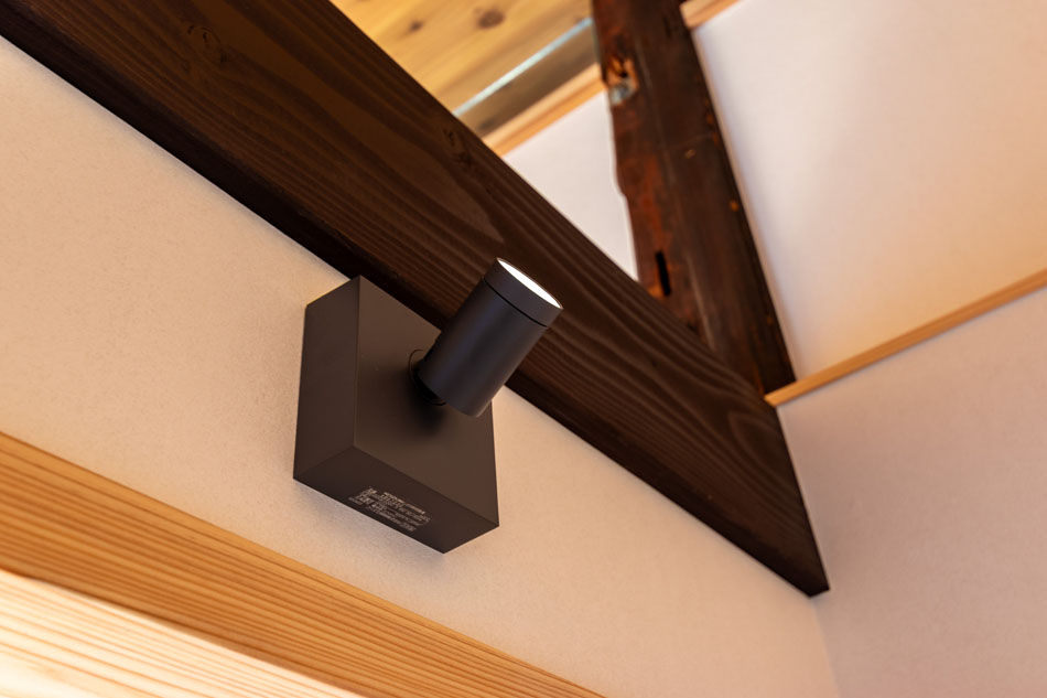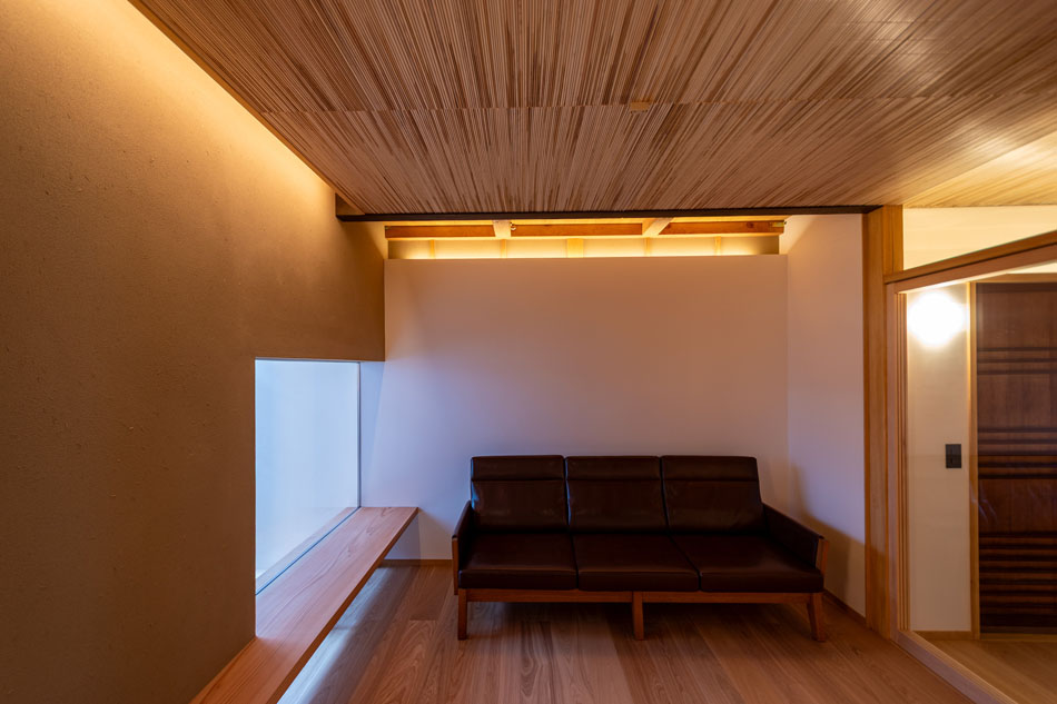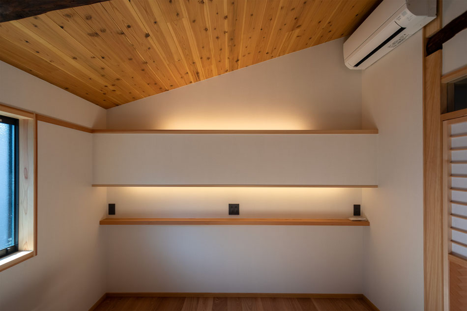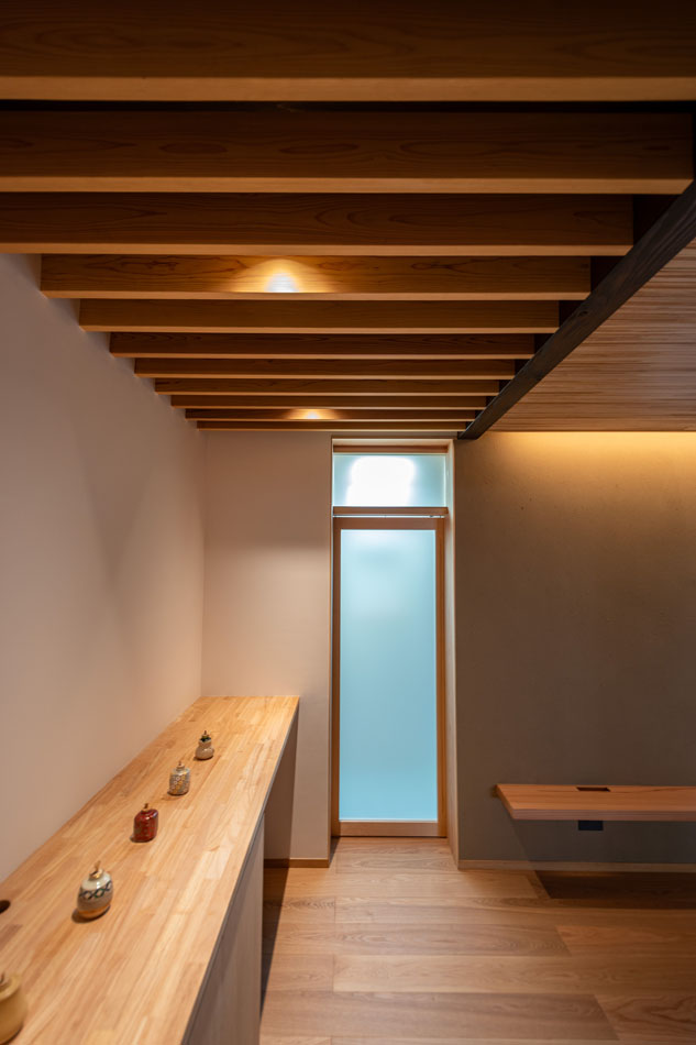 東側の壁面と収納カウンターは、展示ギャラリー、あるいは座敷の床の間のような位置づけのスペースです。ルーバー内に設けた360度回転可能なスポットライトにより、展示物を美しく際立たせます。