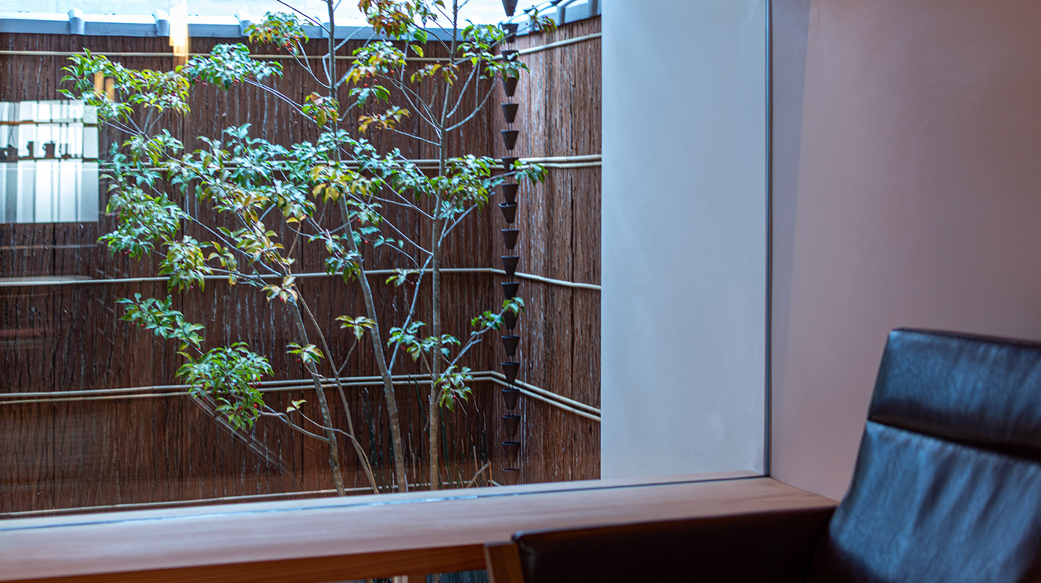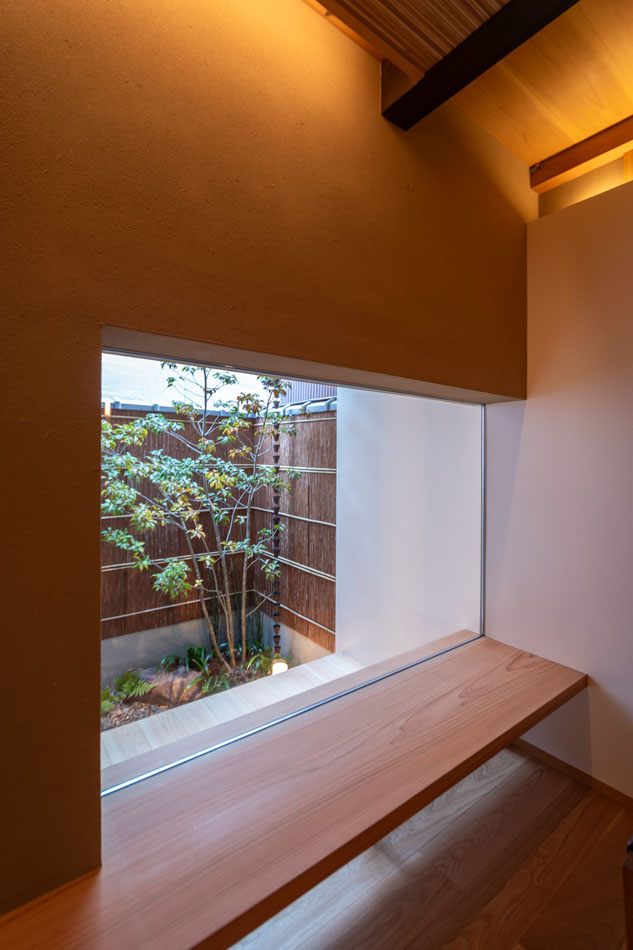 坪庭に面した棚下の窓を開けると、室内にやさしい風が通り抜けます。6月頃には、小さな白い花を咲かせるソヨゴの甘い香りが、ふんわりと室内に広がります。