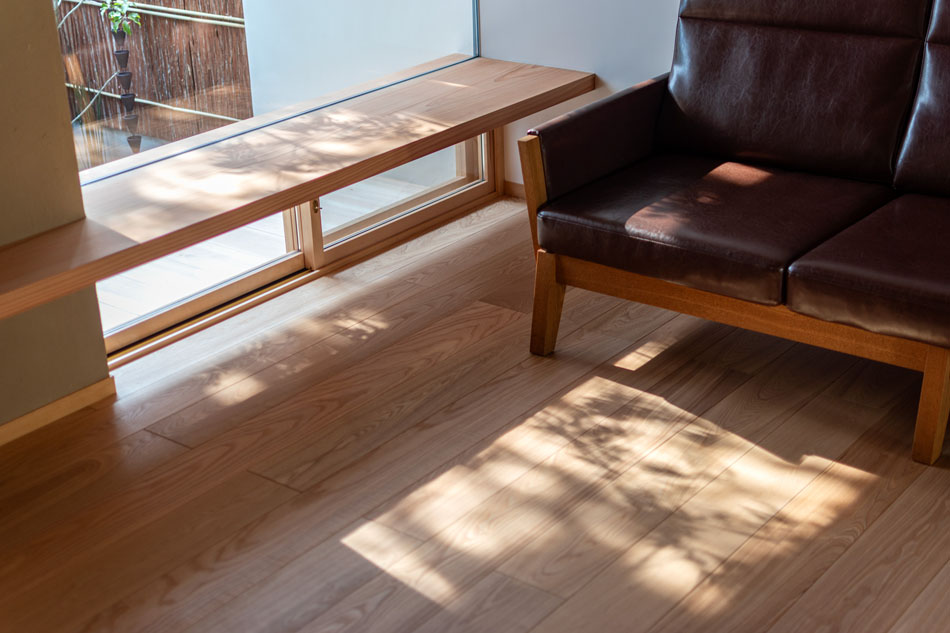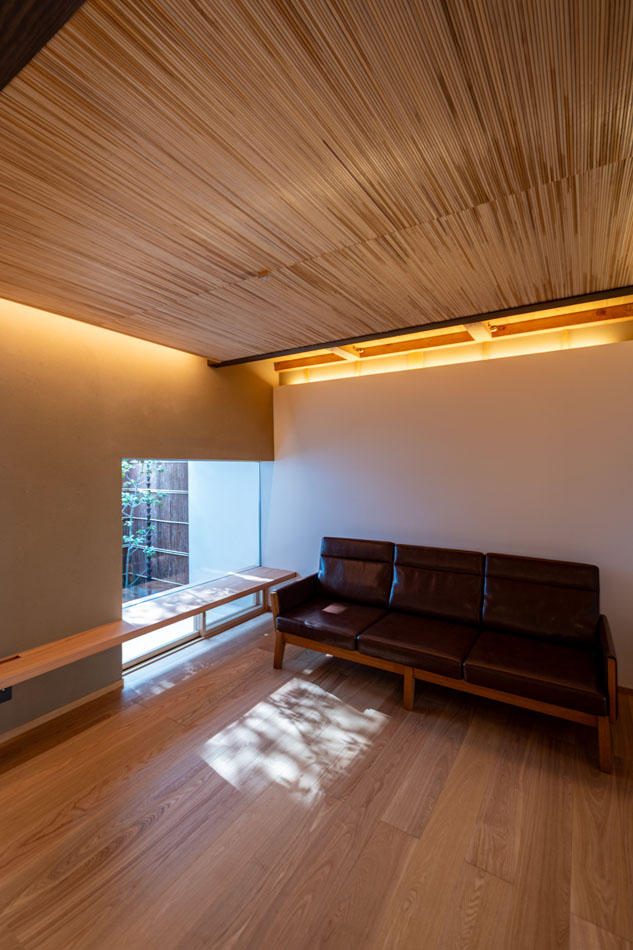 一階では、坪庭とピクチャーウインドウを組み合わせ、周囲からの視線を遮りつつ、光や緑を室内へとやさしく引き込みます。