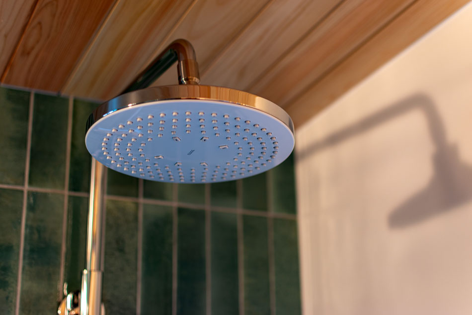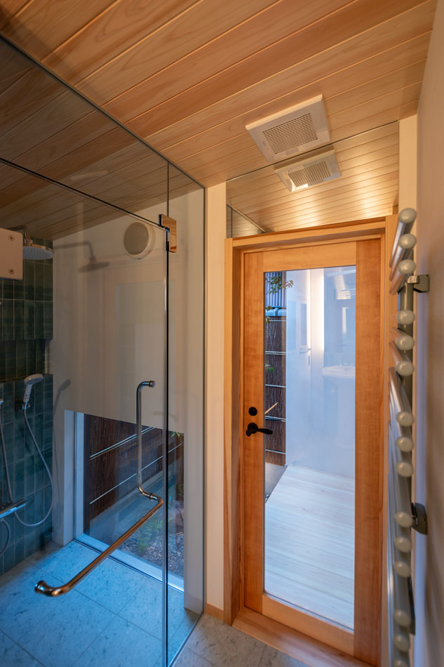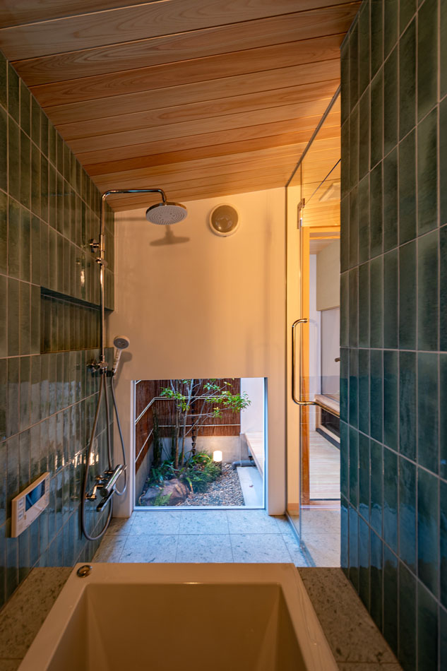 湯舟につかりながら、ガラス張りの開口部越しにお庭を眺めることができます。浴室内の照明を控えめにし、お庭の照明を明るくすることで、樹々が幻想的に浮かび上がります。