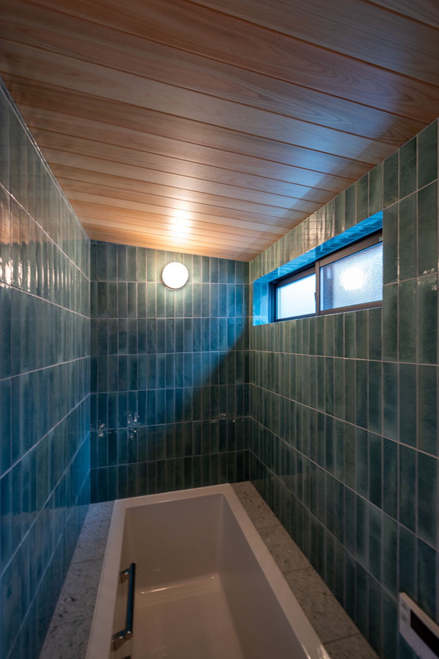 外壁を彩る深緑のタイルは、素朴でありながらもどこか愛らしい表情を添えています。