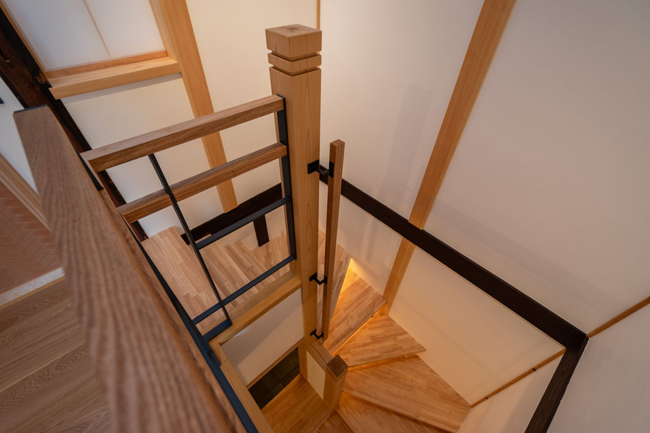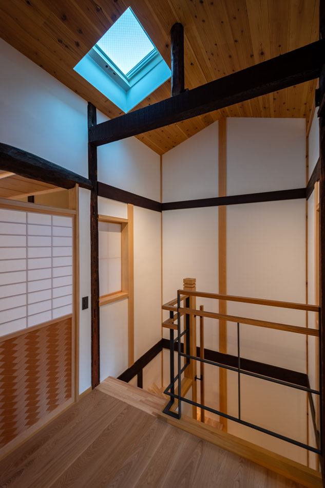 階段吹抜け上部に設けた電動開閉式の天窓は、やわらかな自然光を取り込みながら、住まい全体に心地よい自然換気をもたらします。