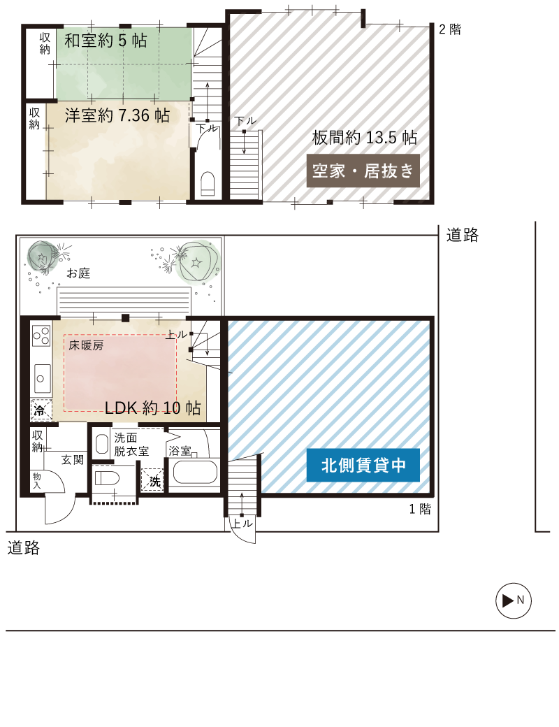 北側は1階が賃貸中で安定した収入が期待でき、2階は居抜きの空間を活かして、事務所やアトリエ、または賃貸運用など、ご自身のアイデア次第で多用途にお使いいただけます。