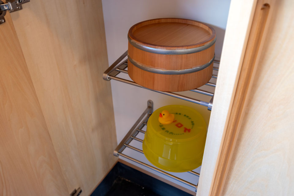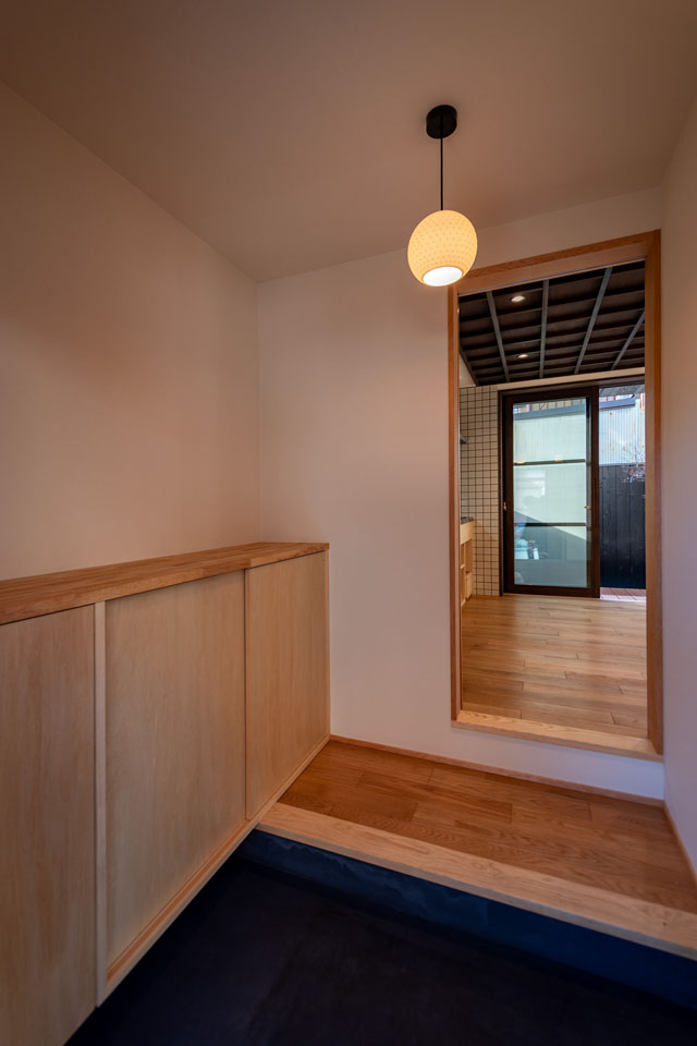 湯上りには、庭を眺めながらくつろげる“休憩室”のようなリビングでゆっくりと。また、玄関の下駄箱には愛用の洗面器や銭湯グッズを置けるスペースを設け、思い立ったらすぐに大浴場へ。銭湯ライフを楽しめる暮らし方を提案しました。
