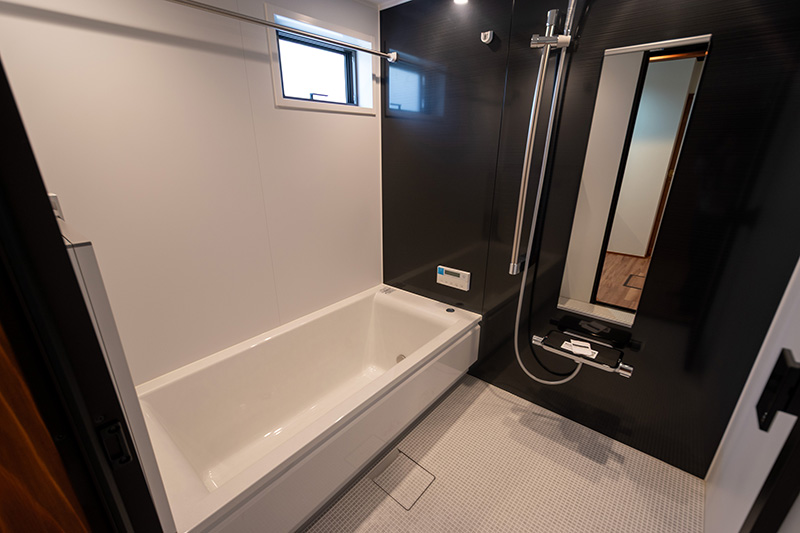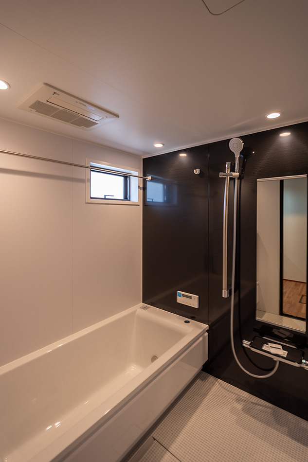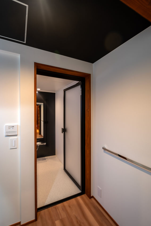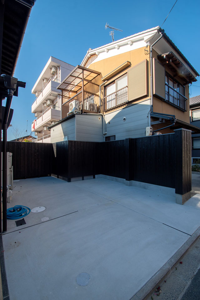 黒を基調としたシックな外観に、室内は木の温もりを感じる落ち着いたデザイン。駐車スペースは1台分を確保し、自転車やバイクも駐車可能です。