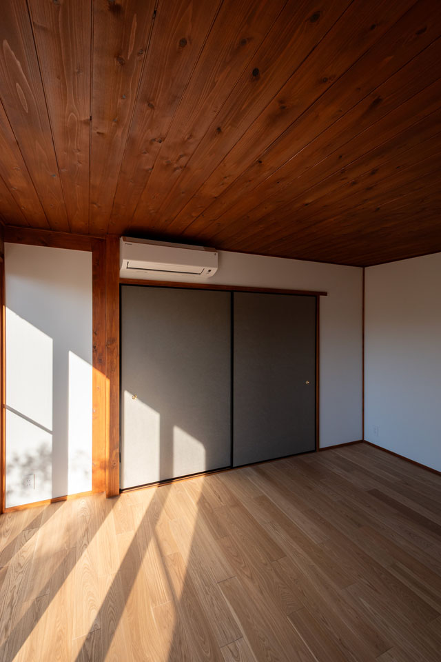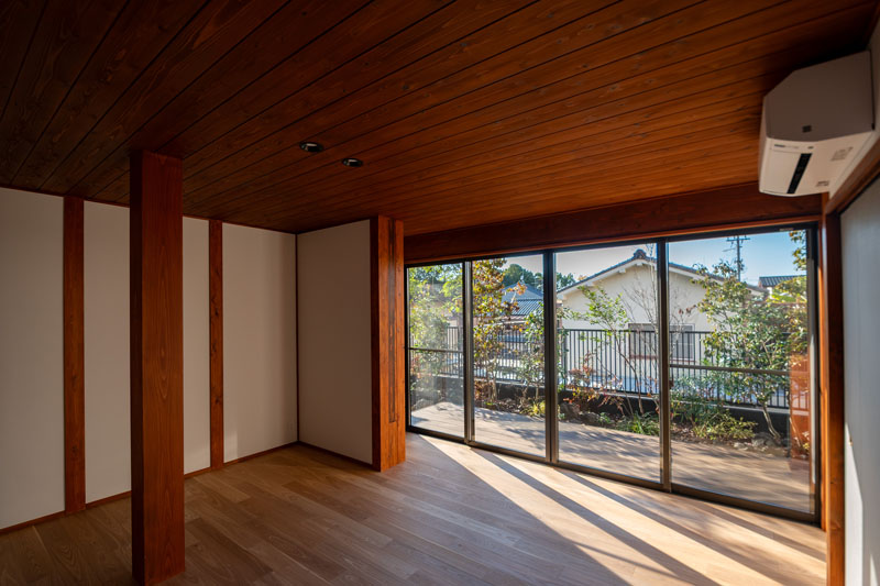 リビングは勾配天井と大きな窓が開放感を演出し、光と風をたっぷり取り込みます。西側には抜けた眺望が広がり、暮らしに心地よい景色を添えます。