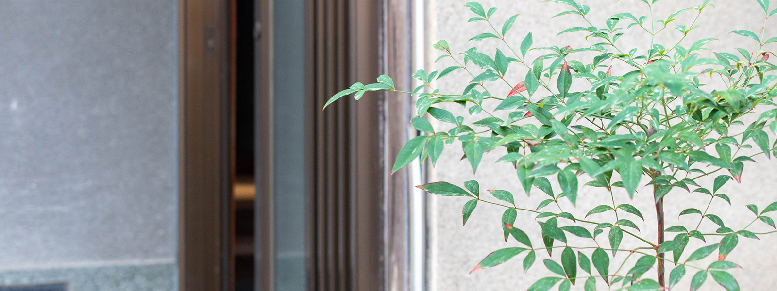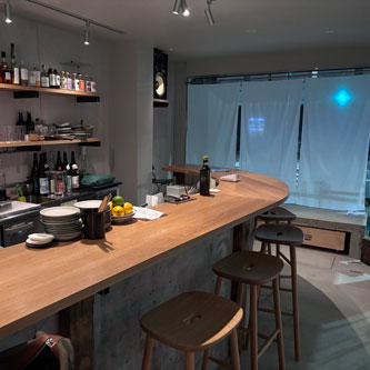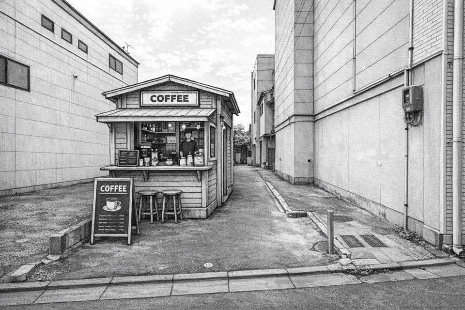 プライベート感のある細い通路を活かし、入口に小さなコーヒースタンドを併設。