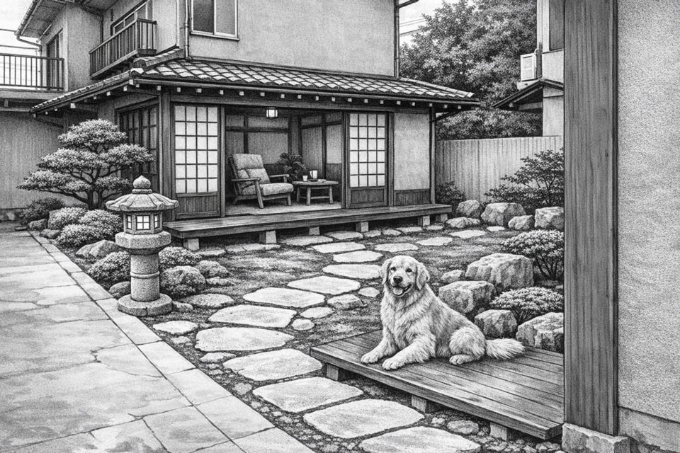 石畳や植栽に囲まれ、ゴールデンレトリバーものびのび過ごせる理想の住まいに生まれ変わります。