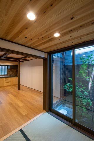 1階は家族が集まるLDKと、坪庭から優しい光が差し込む小さな2帖の多目的和室。