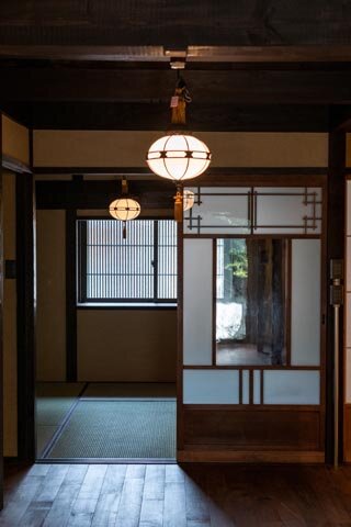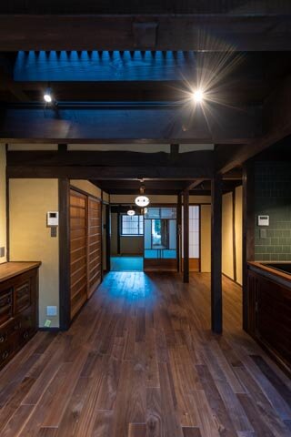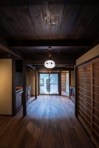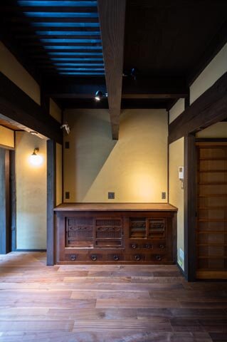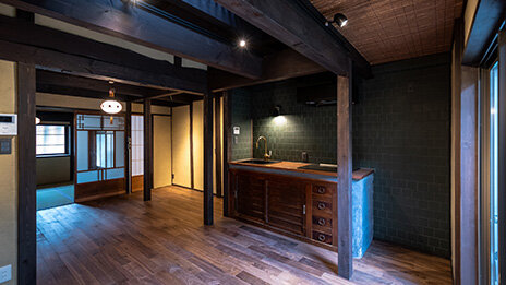 また、経年変化により色艶が増した水屋箪笥や古建具がリノベ済みの空間と調和し、柔らかい雰囲気を与えています。