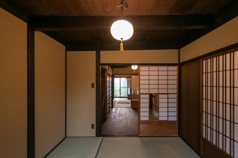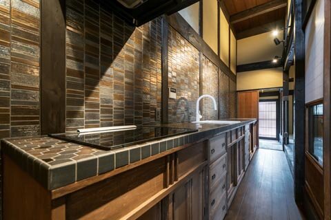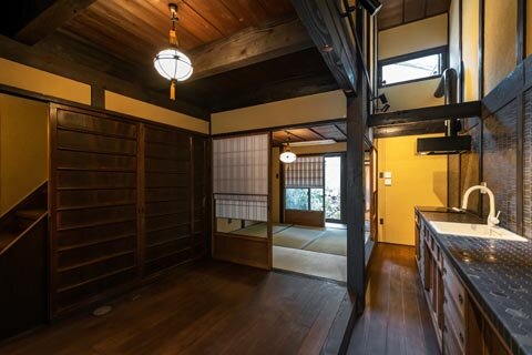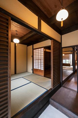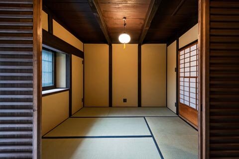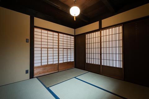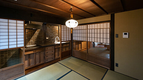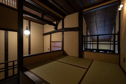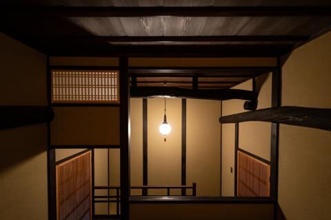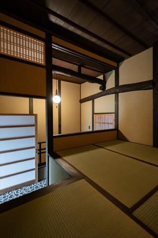 京町家の造りと和のしつらえ 直線が重なりあう凛とした和の空間に、おぼろに浮かぶ照明の光。