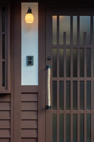 京町家の特徴である、格子・欄干(らんかん)・下見板張り(したみいたばり)を持つリノベーション済みの京町家。