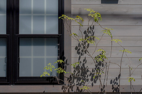 板張りの壁に4つの窓が並ぶ、洋館を思わせる京町家。