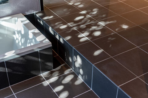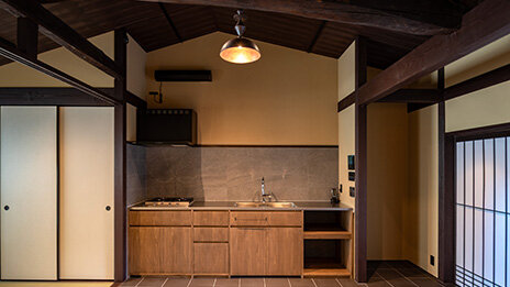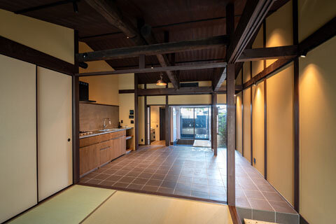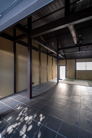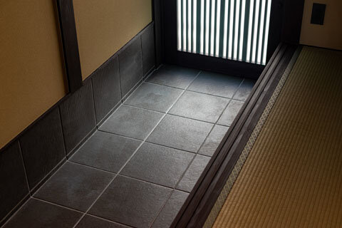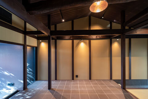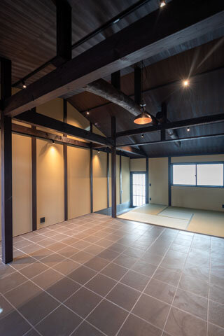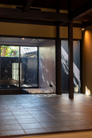 室内は間仕切りをなくし、玄関からバスリビングまで床に同じタイルを敷き詰め、勾配天井で広がりを演出。一室空間として、開放感を大切にしました。