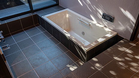 浴槽から窓を開ければ、すぐにテラスへ。外気浴もくつろぎのひとときにセットされています。